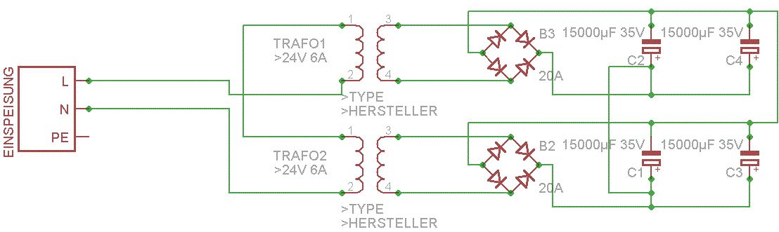 Ich habe den 4x100W Verstärker den gibts grad aber auf ebay nicht mehr deswegen hab ich den link nicht mehr. jedenfalls stand dort 14..39V Ampere nicht genau aber ich gehe von 10-15 aus da der verstärker eh nicht ganze 400W zieht. Ich habe mich für 24V entschieden, da ich davon zwei trafos habe, welche ich dann parallel schalten will. Siebelkos: Ich hab hier n paar 10000µF und n paar 15000µF da ich denk grad so an die 15er. Ach und auf die Ideee mit dem Festspannungsregler bin ich gekommen da ein bekannter gemeint hat ich muss es bei einem Verstärker dieser Ordnung schon sauber machen. Er hatte den Vorschlag einer Intelligenten "Gleichrichtung" über geregelte Thyristoren. Dies war mir jedoch zu aufwändig