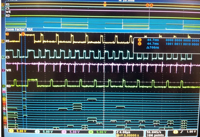 Hallo, ich versuche gerade das LCD vom MCB1700 (Keil) über 16 Bit anzusprechen. (Das LCD wurde an freie nach außgeführte I/Os des MCB angeschlossen) Es handelt sich dabei um ein 240320L8 von AMPIRE. Wie ich herausgefunden habe, wurde dies durch ein 240320LD ersetzt soll aber kompatibel sein. http://01848aa.netsolhost.com/product_specs/2.4-specs/ADI_2.4_AM-240320LDTNQW-00H.pdf Aus dem Datenbaltt geht hervor dass der Interfacemode über entsprechende HW Jumper angepasst werden muss. Diese habe ich umgesetz und es identifiziert sich auch mit dem DeviceCode 0x9320 woraus allerdings hervor geht das es sich nicht wie bei dem LD um einen SPFD5408B Controller sondern einen ILI9320 handeln müsste. Nun versuche ich es über 16bit zu initialisieren, leider bisher erfolglos. Werder der Code aus der UTFT Lib noch die Sampels des Chipherstellers http://www.densitron.com/uploadedFiles/Displays/Support/ILI9320AN_V0.92.pdf führten zu erfolg. Habe mir die Daten auf dem Oszilloskop (siehe Anhang) auch schon angesehen, das sieht (meiner Meinung nach) alles richtig aus... Hat jemand eine Idee woran es liegen könnte. Übertrage ich die Daten vllt zu schnell oder kann es sein dass das LCD nur SPI unterstüzt und garkeine 16 bit Datenübertragung. Aber warum bekomm ich dann einen gültigen DeviceCode zurück? Grüße Raven