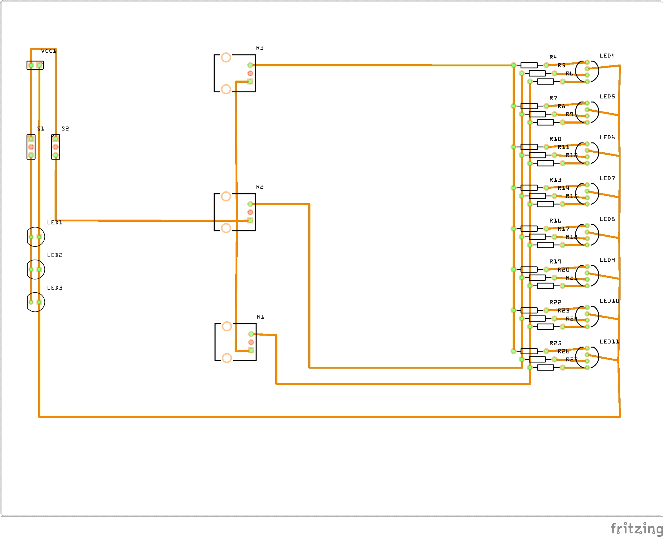 LED1, LED2 und LED3 sind ganze LED-Stränge für 12V ? R1, R2, R3 sollten 3 Potis zur Einstellung der RGB Farben der anderen LEDs sein ? Bist du sicher, daß man deren beide äusseren Pins anschliessen sollte ? Bist du sicher, daß die Potis den Strom aushalten, den die LEDs zusammen brauchen ? (Einfache Rechnung: Beispielsweise ein 100 Ohm, 0.5 Watt Poti erlaubt 7V und damit 70mA. Wenn die LEDs einer Farbe über ihre Vorwiderstände mehr als 70mA zusammen benötigen, wäre der also unterdimensioniert.)