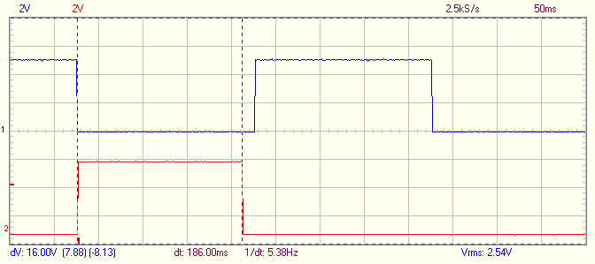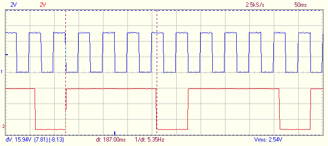 Hallo, ich brauch mal Unterstützung bei dem Ultraschallsensor HC-SR04. Ich bekomme keine auswertbaren Echo-Daten. Sofern ich die Doku richtig verstanden habe, zeigt das Osszillogramm, dass der Sensor kein Objekt erkannt hat. Nach der fallenden Triggerflanke(blau, 20 Hz) müsste doch der Echo-Ausgang die Entfernung abbilden. Stattdessen bekomme ich immer 187 ms dauernde High-Pegel (rot, 187 ms) unabhängig davon, in welchem Abstand eine Metallplatte vor den Sensor gehalten wird. Hab ich irgendeinen grundlegenden Fehler übersehen oder ist das Teil defekt? Danke für jeden Hinweis!