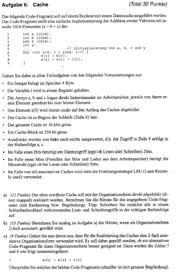 Ja, das wäre viel zu viel. Nochmal neu: Also für den Direct mapped Cache gilt doch: 512bit / 4 Byte = 8 Integer pro Block Mit 16kbit/512bit = 64 Sätze 3 offset bits 6 index bits Nochmal für Zeile 7: Nun wird ja A[0] (dezimale Adresse 0) im ersten Block gespeichert -> miss B[0] hat die dezimale Adresse 4*1024 = 4096, also ebenfalls Block eins eins, da dort A[0] ist -> miss nun wird B[0] aus dem Cache geholt -> Hit und wird in A[0] geschrieben -> miss Stimmt das soweit? Gruss