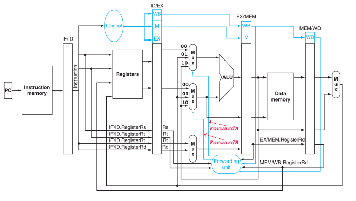 Ich habe hier mal noch ein Bild zum Datenpfad hochgeladen. Die Multiplikation ist damit eigentlich nach der EX Stufe bekannt. Forwarding wird aber nicht von Ex->Ex unterstützt, sondern nur von Mem->Ex