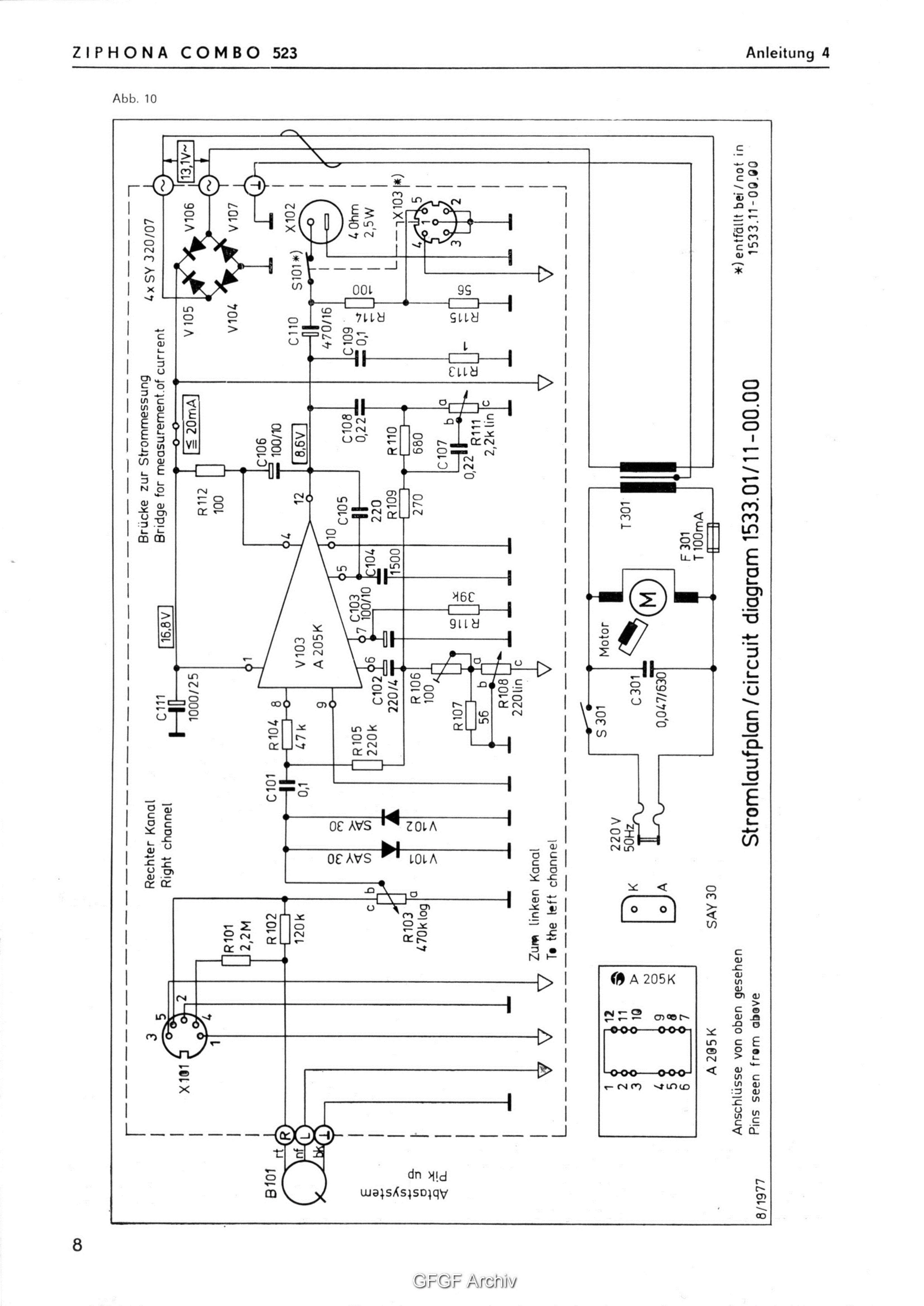 Die Angaben sind ohne Maßeinheiten. Schwierigkeiten bereiten Kondensatoren. Bei Vergleich Schaltplan - Bestückung der Platine war zumindest für C 101 (Wert im Plan 0,1)- Bezeichnung auf Polystyrol-Kondensator 100n, also 0,1 µF, eine Logik zu erkennen. Jedoch ist diese bei den anderen Kondensatoren nicht der Fall. Da das Gerät bereits durch mehrere (Bastler-)Hände gegangen sein muß (erkennbar an ausgetauschten Elkos neuerer Bauart), kann es natürlich sein, daß andere Werte verwandt wurden, als laut Schaltplan vorgegeben. So fehlen außerdem die Dioden V101,V102,V201,V202 gänzlich. Gäbe es denn für die vorgenannten Dioden äquivalente, noch in Produktion befindliche Typen?