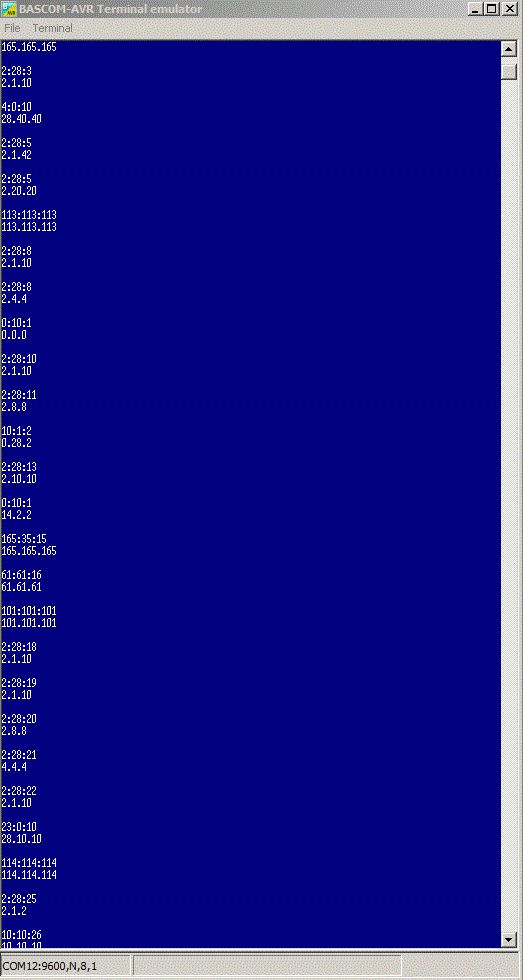 Hallo, ein vermeintlich einfaches Basic Programm liest eine i2c RTC vom Typ RV-3029 aus. Der Chip ist OK, auch die Beschaltung. In einer anderen Umgebung läuft die Hardware einwandfrei (PIC). Die Uhr muss nicht gesetzt werden, zeigt nach Reset in der anderen Umgebung "Time is 0:0:1 Date is 0/0/2000". Ich habe schon Tage gekämpft und finde einfach keinen Anhaltspunkt. TWI Rate geändert, und vieles vieles mehr.. Anbei der recht übersichtliche Basiccode und ein Screenshot von dem Output des Programms. Es wäre eine große Hilfe wenn Ihr mir zeigen könntet wo ich etwas falsch mache. Danke im Voraus. CODE: $regfile = "m1284pdef.dat" ' 32 $crystal = 16000000 ' 8 MHz $hwstack = 40 $swstack = 16 $framesize = 32 Baud = 9600 $lib "I2C_TWI.LBX" Enable Interrupts Dim Weekday As Byte Dim Tmp As Byte Dim I As Byte Dim Var_rv3029_seconds As Byte Dim Var_rv3029_minutes As Byte Dim Var_rv3029_hours As Byte Dim Var_rv3029_days As Byte Dim Var_rv3029_weekdays As Byte Dim Var_rv3029_months As Byte Dim Var_rv3029_years As Byte Dim Alle_register(50) As Byte Weekday = 2 Sda_port Alias Portc.1 Scl_port Alias Portc.0 Config Twi = 400000 Const Rv3029_write = &B10101100 'Adresse des DS1307 = &HD0 (schreiben) Const Rv3029_read = &B10101101 'Adresse des DS1307 = &HD1 (lesen) I2cinit Gosub Rv3029_clear_pon Do Gosub Read_clock_page Print Makedec(var_rv3029_hours) ; ":"; Print Makedec(var_rv3029_minutes) ; ":"; Print Makedec(var_rv3029_seconds) Print Makedec(var_rv3029_days) ; "."; 'Print Makedec(var_rv3029_weekdays) ; " "; Print Makedec(var_rv3029_months) ; "."; Print Makedec(var_rv3029_years) Print "" Waitms 900 I2cinit Loop Read_clock_page: I2cstart I2cwbyte Rv3029_write I2cwbyte &H08 I2cstop I2cstart I2cwbyte Rv3029_read I2crbyte Var_rv3029_seconds , Ack I2crbyte Var_rv3029_minutes , Ack I2crbyte Var_rv3029_hours , Ack I2crbyte Var_rv3029_days , Ack I2crbyte Var_rv3029_weekdays , Ack I2crbyte Var_rv3029_months , Ack I2crbyte Var_rv3029_years , Nack I2cstop Return end
