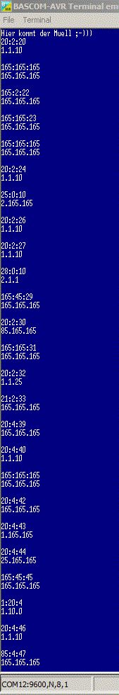 MWS schrieb: > Beachte Power On Reset im DB und initialisiere die RTC mit > gültiger Zeit > und Datum. Habe 3 von den RTC's und habe 2 im Tausch unter Bascom betrieben, die 3. mit nem PIC und mmbasic. Die 2 mit denen ich Bascom getestet habe, haben ne HW Macke. Die 3. funktioniert mit dem Code unter Bascom und am PIC. Das ist echt der Hammer, so ein Zufall. Danke für die Hilfe. Es zeigt wieder: " Es kann nicht sein, was nicht sein kann!"