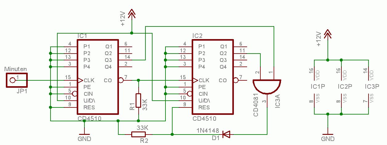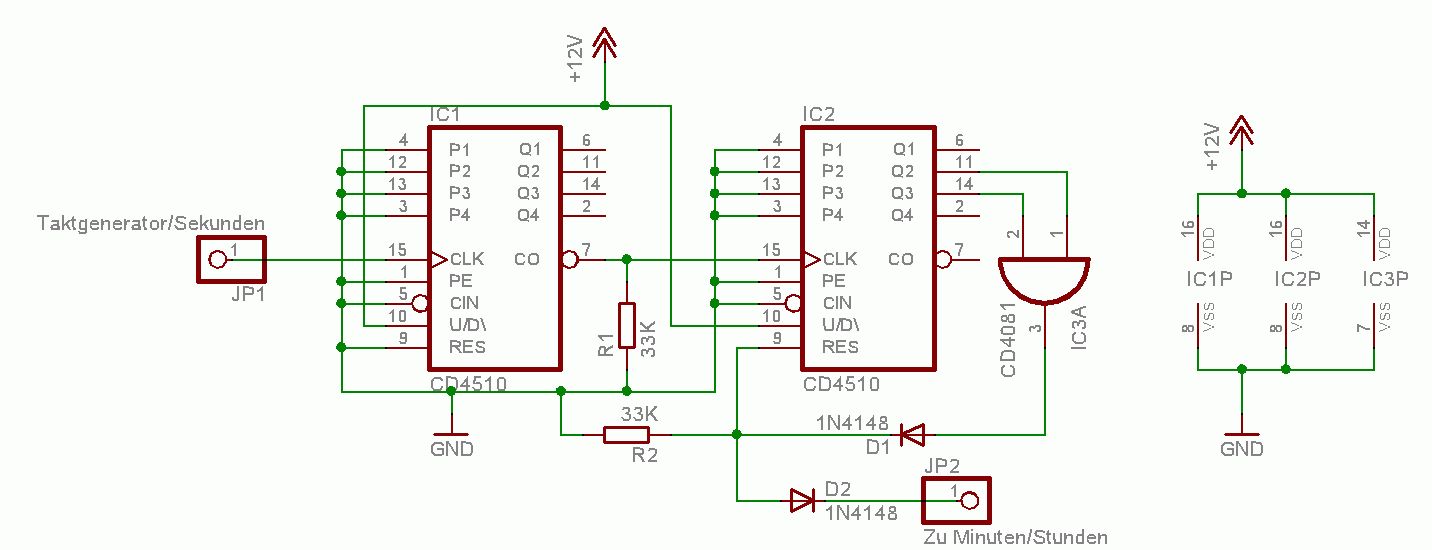 Hallo zusammen, ich bin zur Zeit am Entwerfen einer Unfallanzeigetafel. Hierfür benötige ich einen 24 Stunden Takt um die Unfallfreien Tage eimal pro Tag hochzählen zu lassen. Ich habe mittels Quarz und Frequenzteiler einen 1 Herz Takt generiert. Aus dem Internet habe ich mir 2 Schaltungen für einen Zähler 60 und einen Zähler 24 (aus einer Digitaluhr) rausgesucht. Verwendet wird hierbei der Zählerbaustein CD4510. Ich habe die Schaltung nun Testweise auf dem Steckboard aufgebaut, jedoch funktioniert diese nicht. Ich habe alle Anschlüsse nochmals mit dem Datenblatt kontrolliert, finde jedoch nicht den Fehler. Ich habe die zwei Schaltpläne mal in den Anhang gelegt. Wäre nett, wenn mir jemand bei der Fehlersuche helfen könnte. Danke im voraus. Fals ich den Fehler finde, werde ich Ihn selbstverständlich hier posten. Lisa