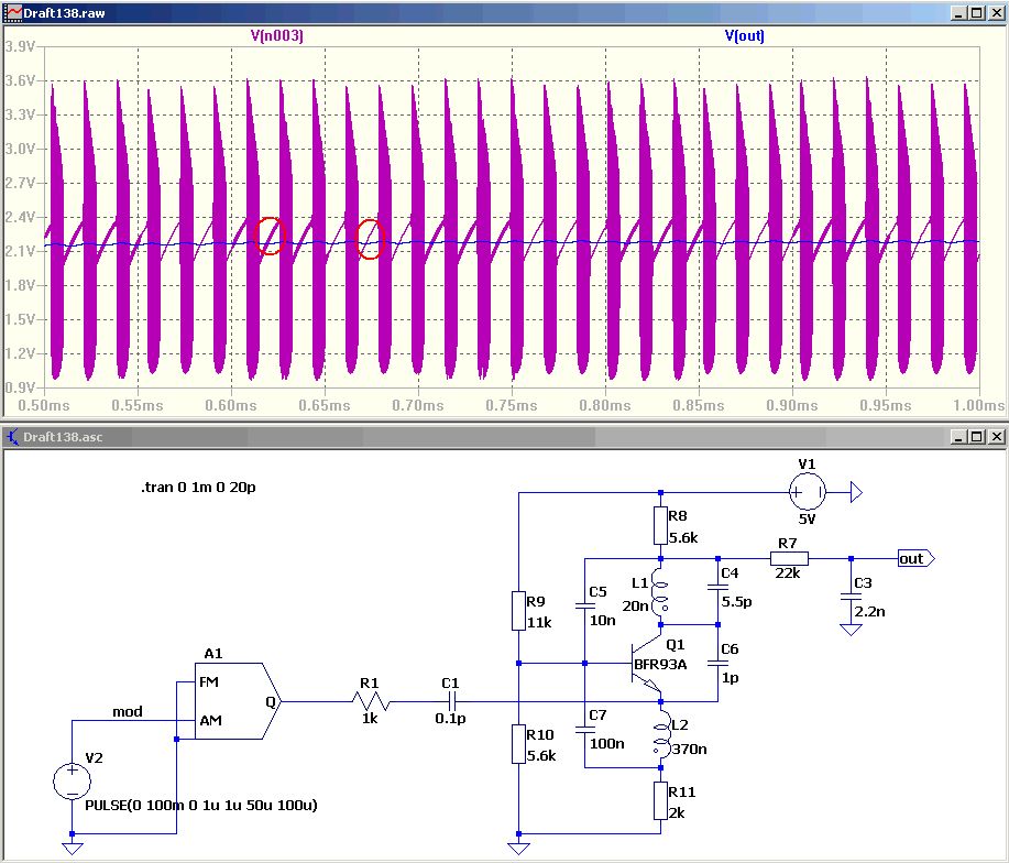 Hallo Max D. Im Anhang befindet sich eine Simulation der Schaltung. Sie pendelt, aber demoduliert nicht so richtig. Die Ursache liegt vermutlich am zu schnellen Anschwingen des Oszillators. Eine Güte-Reduktion von L1 hab ich aber schon probiert. Bei dieser Frequenz kommt es eher auf den Aufbau an, als auf die Schaltung. Deshalb sollte das Layout möglichst übernommen werden, auf keinen Fall auf Lochraster oder gar Experimentier-Board probieren. Hier gibt es eine ähnliche Schaltung: http://members.iinet.net.au/~cool386/4tr/4tr.html Gruß, Bernd