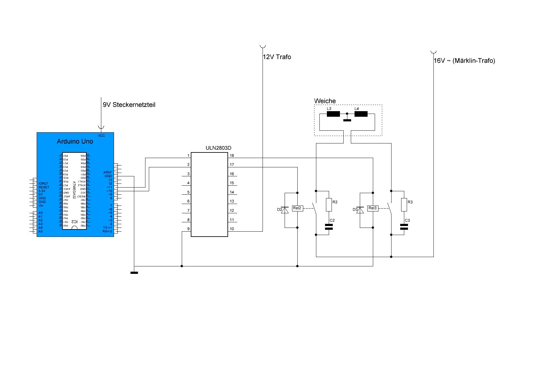 Hi Ich seh eigentlich euer Problem nicht. Warum nicht ein 12V Steckernetzteil 1 A für die Relais und gut ist. Relais mit Impuls schalten, genau so, als würde man die Taster benutzen. Das Prinzip der Ansteuerung mittels µC (Ob Arduino oder was auch immer) hatte ich bereits skizziert. Gut, du hast einen zweiten Stromkreis. Na und? Deine Taster für einen Handbetreib kannst du ja immer noch den Relaiskontakten parallel schalten. Wichtig wäre vielleicht eine Überwachung des Schaltimpulses für die Weichen, da diese keine 100% ED haben und mit Gleichstrom betrieben vermutlich sehr schnell den für die Funktion wichtigen Rauch entweichen lässt. Ich hab mir mal die kleine Mühe gemacht, eine Skizze anzufertigen. Die Schaltung mit den Optokopplern muss nicht, kann aber als Rückmeldung wieder in den µC zurückgeführt werden und evtl. auch die Einschaltdauer überwachen. Da ist an der Märklin-Seite keine Elektronik und das halte ich auch für vernünftig. Zumal hier doch nur scheinbar geringe Elektronikkenntnisse vorliegen. Damit muss das Projekt aber nicht sterben und ich möchte auch Mut machen, diese Aufgabe umzusetzen. Aber nicht gleich mit einer komplexen Änderung der Weichenantriebe. Wenn du mit einem Arduino ein Relais schalten kannst, dann gibt es doch gar kein Problem. Lass Märklinspannung komplett da, wo sie hingehört, an den Kontakten. Nimm ein Steckernetzteil (oder auch ein beliebig anderes) aus dem du mit einem Spannungsregler die Versorgung für den Controller abzweigst. Die 12 V lässt du direkt den Schalttransistoren für die Relais zukommen. 5V Relais mögen praktisch sein, aber sie sind teuer, haben oft nicht genug Schaltleistung und belasten die 5V hinter dem Regler, was dieser mit erhöhter Verlustleistung zur Kenntnis nimmt. Gruß oldmax