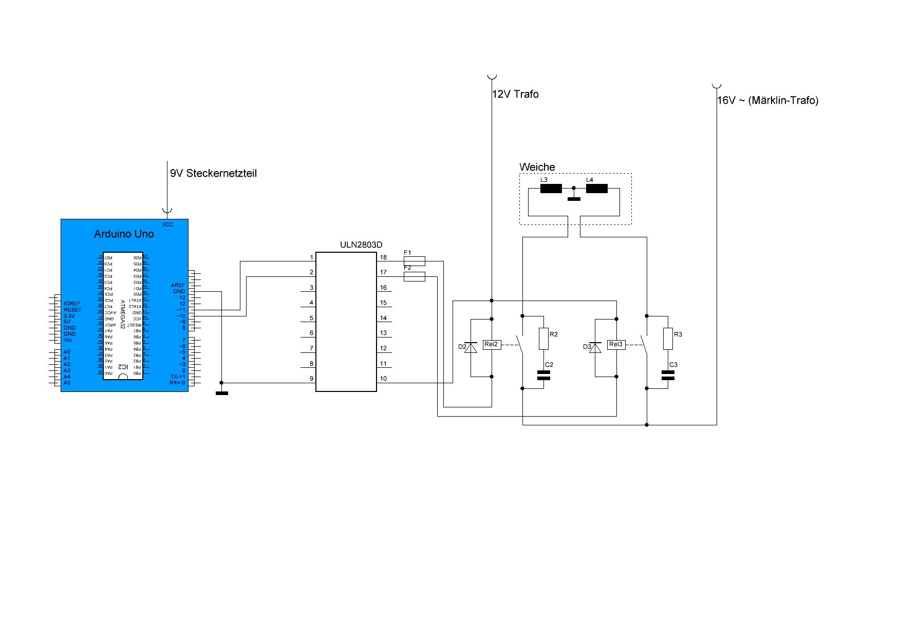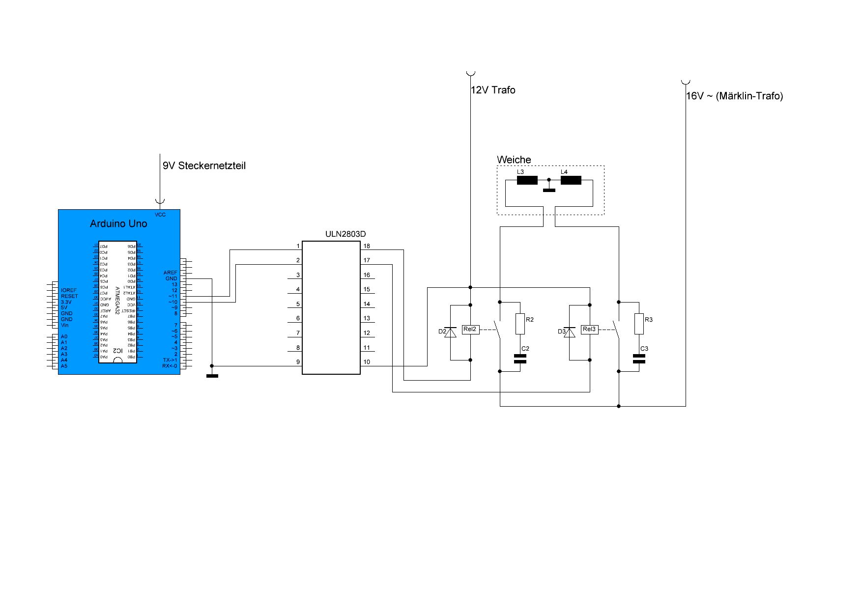 Hallo liebe Experten! Ich muss mich mal wieder in meiner Unwissenheit mit einem Projekt an euch wenden. Ziel des ganzen ist eine Schattenbahnhofssteuerung per Arduino Uno auf einer komplett analogen Märklin-M-Anlage mit Wechselspannung. Habe mich derzeit erstmal nur mit der Weichensteuerung und vor allem deren Hardware auseinander gesetzt. Leider nutzen die meisten Leute im Internet digitale Anlagen und haben es daher etwas einfacher. Zusätzlich findet man im Falle von analogen Anlagen meist Gleichspannungsanlagen (Trix oder Fleischmann). Ich bin mit meinen Recherchen nun soweit, dass ich glaube folgendes zu wissen und bitte euch, das mal zu prüfen: - Eine Weiche verfügt über zwei kleine AC-Motoren, die je nach Weichenstellung, die Zungen in die eine oder andere Richtung ziehen. Demnach muss alles "doppelt" ausgeführt werden. Daher hat die Weiche auch zwei Anschlüsse für "Abzweig" und "Geradeaus". Der Trafo von Märklin liefert 16V AC. Die Meinungen über Ströme beim Weichenschalten gehen von 200 mA bis 500 mA. - Der Arduino Uno kann von der Ausgangsleistung her die Weichen nicht treiben, daher brauche ich einen Schalter. So wie es scheint, sind TRIACs eine adäquate Lösung für AC-Motoren. Stimmt das? - Beim Schalten von Motoren (=Spulen) werden Rücklaufdioden benötigt. Nun ist der Ground einer Weiche von Märklin aber das metallene Gleisbett. Hier stellt sich also die Frage, wie man die Diode dann zwischen die beiden Pins der Motoren bekommt oder ob es eine andere sinnvolle Lösung gibt, ohne dass man die Weiche auseinander nimmt. Soweit der Stand von mir mit hoffentlich nicht zu viel Text :) Ich wäre über alle Tips dankbar! Gerne auch sowas wie "Alles Mist! Mach es so und so". Danke und beste Grüße, Ole