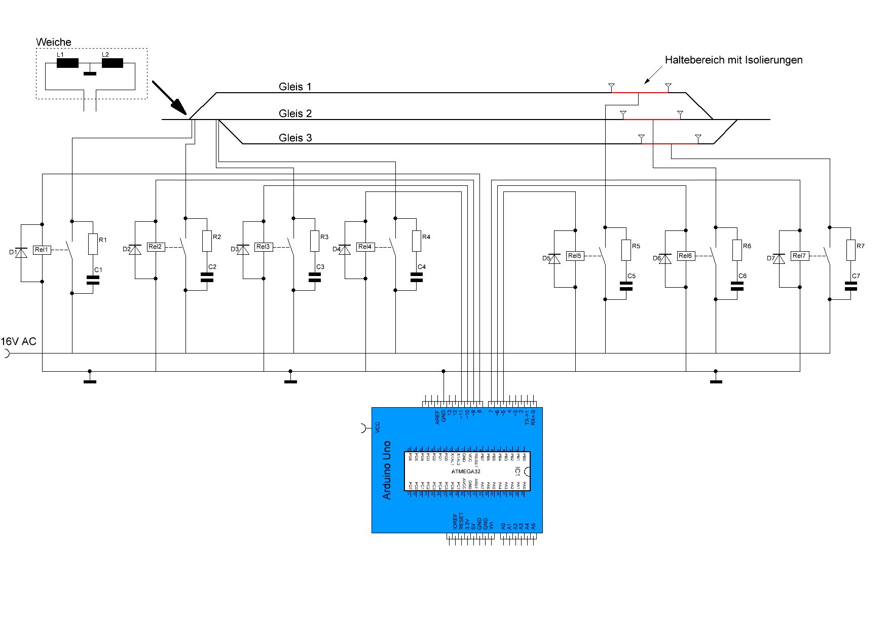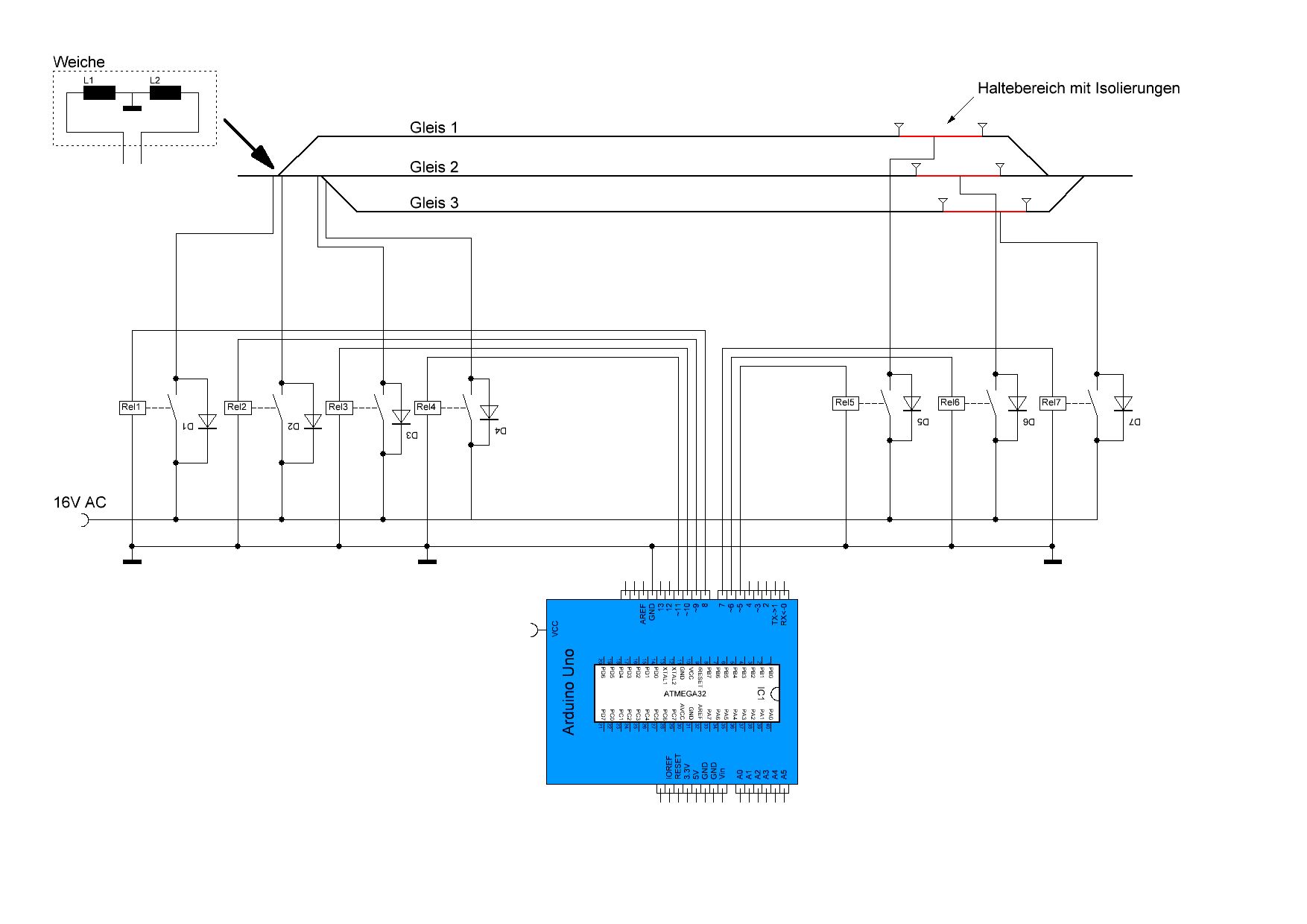 So, alles ist fertig und funktioniert! Hier mal die Funktionen, die die Schaltung nun abdeckt: - 3-gleisiger Schattenbahnhof - Steuern der Einfahrtsweichen - Steuern des Fahrstroms in den Haltebereichen - Lichtschranken zur Zugdetektion - Abfrage der Gleisbelegung bei Anschalten der Anlage - Zwei Taster (Rot und Grün) mit unterschiedlichen Funktionen je nach Betriebsphase - 3 LEDs zum Anzeigen von Belegtmeldungen - Kontinuierlicher Betrieb: Ein Zug fährt ein, ein anderer aus - Stets Auffüllen auf zwei Züge, falls Bahnhof leer oder unterbesetzt - Roter Taster im Betrieb: Durchfahrtsmodus starten - Grüner Taster im Betrieb: Zugausfahren erzwingen Die Programmierung war recht einfach und ist sicherlich nicht als "schön" zu bezeichnen, tut aber ihren Zweck. Ich kann bei Bedarf auch gerne meinen Code zur Verfügung stellen. Wenn ich ganz viel Langeweile haben sollte, müsste ich den Code noch mal komplett neu gestalten und zwar diesesmal sinnvoll umsetzen :) Die Lichtschranken sind übrigens einfache LEDs mit Vorwiderstand und zur Detektion Spannungsteiler aus Photowiderstand und Pull-Up-Widerstand. Der Spannungsteiler wird dabei von einem analogen Port des Arduino ausgelesen. Hinzu kamen noch drei Status-LEDs und zwei Taster, mit welchen zu Beginn die Gleisbelegungen eingegeben werden müssen. Während des Betriebs lässt sich damit das Verhalten des Schattenbahnhofs auch ein wenig beeinflussen (Zugdurchfahrt und Zugausfahrt erzwingen). Vielen Dank an alle, die mir hier weiter geholfen haben. Ohne Euch hätte ich das wahrscheinlich niemals so schnell hinbekommen. Falls noch Fragen zu Details oder sonstwas bestehen, gerne her damit. Lg, Ole