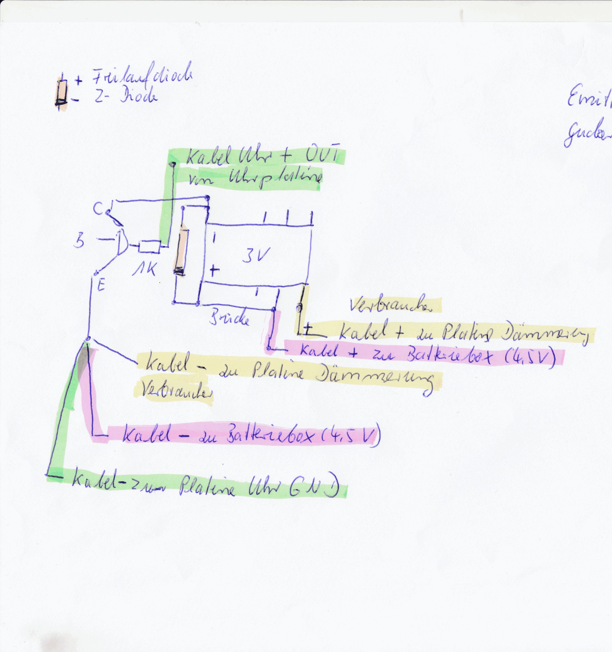 :) Das glaubst du mir jetzt nicht. Diese haben Ihre eigene Stromversorgung. Also der Dämmerungsschalter schaltet das Relais und schaltet die Kerzen an und wieder aus, je nach Helligeit. Auf der Platine des Dämmerungsschalter habe ich auch ein Relais, um die Kerzen mit Ihrer eigenen Spannung zu versorgen. Bei den Kerzen habe ich den Ein und Ausschalter unterbrochen und zur Platine des Dämmerungsschalter zum Relais geführt. Die Uhr ist vor dem Dämmerungsschalter. Wie gesagt soll eben nachts aus sein. Ich habe mal ein Schaltbild von der Uhr angehängt. Hier siehst Du die Kabelführung von der Uhr zu meinem Dämmerungschalter. Ich weiß Laie ;). Hoffentlich kannst was damit anfangen.