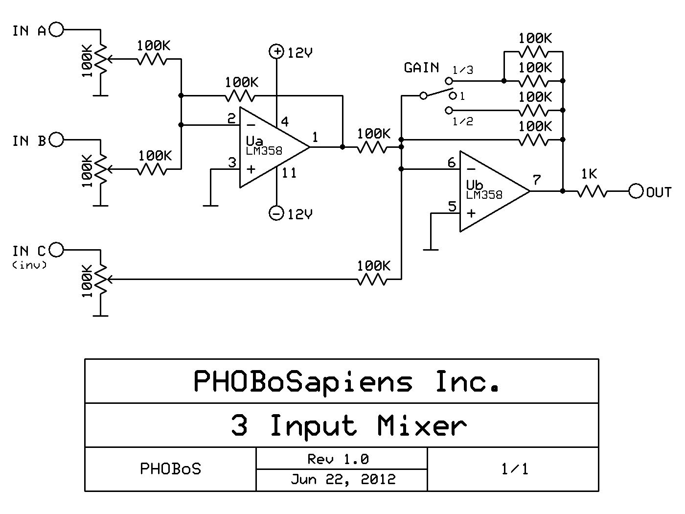 Hier ein Beispiel aus einem recht einfachen Synth-Modul, welches auch leicht als Audiomixer anzupassen ist. Den Eingang 3 kann man weglassen und dafür Ua kopieren und die Ausgänge an den zweiten Teil der Stufe senden. Das wären je 4fach Opamp 8 Eingänge. In der zweiten Stufe einen NE5534 statt 358 verwenden. Und als Eingänge auch was anderes z.B. 074 etc. Ist doch einfach, oder?