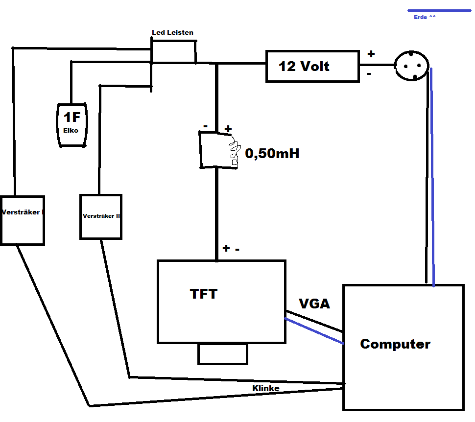 Hallo Ich habe ein TFT den ich jetzt mit an das 12Volt Netzteil meiner Anlage hängen muss (Netzteil ist stark genug) problem ist der Monitor verursacht extreme Störungen. Darauf hin habe ich zwischen Netzteil und TFT eine spule von 0,50mH verbau aber das ändert auch nix. es gibt keine streifen auf dem Monitor der arbeitet normal aber sobald er an geht fühlen sich die Verstärker massiv gestört (brummen und knacken) Würde es was ändern wenn ich nach der spule noch eine Diode einsetzte ? Oder ein elko vor der spule ? Hat jemand eine hilfreiche Idee/hinweis für mich ??