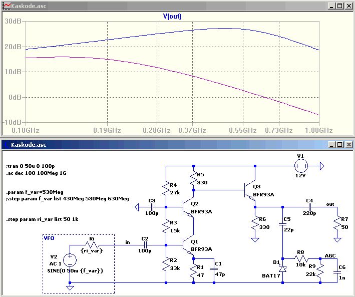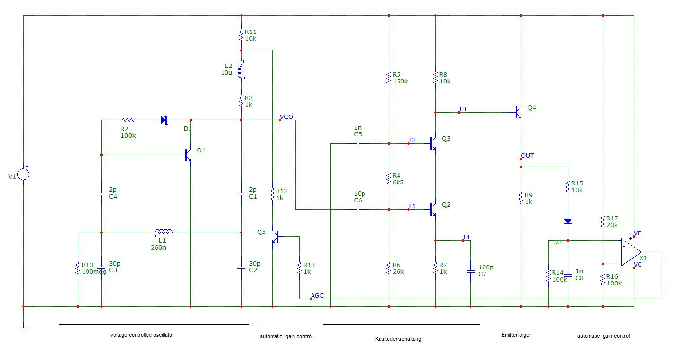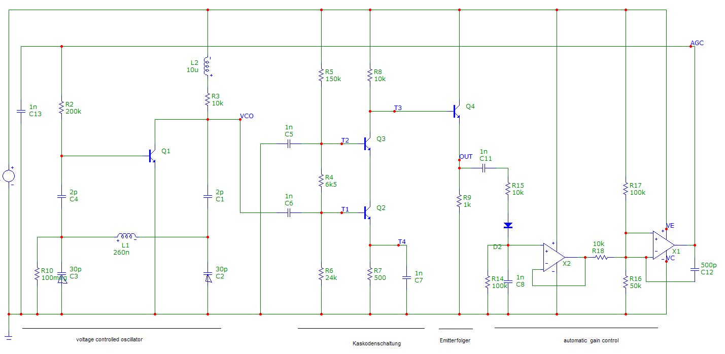 An der Kaskode musste einiges verändert werden, damit die einigermaßen funktioniert. Die Eingangsimpedanz ist ziemlich frequenzabhängig, dadurch hat sie schon bei einer Quellimpedanz von 1kOhm fast keine Verstärkung mehr. Mit 50 Ohm gehts aber. Der Oszillator stellt sein Signal mit einer Impedanz von ca. 10 kOhm zur Verfügung, da schwingt garantiert nichts mehr. Beim HF-Gleichrichter muss eine geeignete Diode wie z.B. eine BAT17 verwendet werden, eine BAT41 geht gerade noch, liefert aber 20% weniger Ausgangsspannung. Fällt der Gleichrichter nach oben zu stark ab, nimmt die Amplitude wegen des Reglers zu. Ein Oszillator, welcher vernünftig schwingt, kann schon 2-3 Volt liefern. Da reicht dann ein Emitter-Folger als Puffer. Die Frage ist, ob nach dem Puffer nicht einfach die Amplitude mit zwei antiparallelen Dioden begrenzt werden kann. Wenigstens fällt dann die Zeit fürs Nachregeln weg.