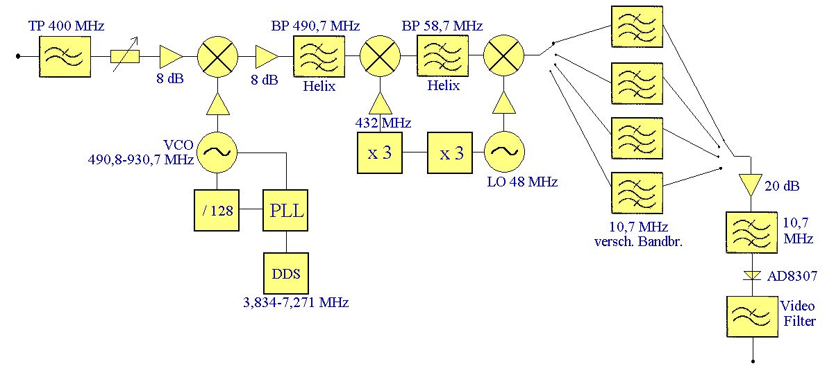 Es ist schon eine Herausforderung einen Oszillator zu bauen, der von 430MHz-630MHz durchstimmbar ist, dabei noch auf wenige 100Hz stabil ist, und eine lineare Spannungs-Frequenzkennlinie hat. Da ist man fast besser mit einen YIG Oszillator bedient, wie es früher benutzt wurde. Der ist zwar auch nicht so stabil, das man bei geringen Bandbreiten ohne eine FFL auskommt. Ein DDS Synthesizer ist zwar stabil und auch schnell genug , was Frequenzwechsel betrifft, aber das Seitenbandrauschen ist eher mäßig und meist nicht ausreichend unterdrückt. Man wird mindestens eine zweite ZF nutzen von z.B 10MHz, Aber bei 10MHz ist die Spiegelfrequenzunterdrückung des 430MHz Helixfilters noch nicht ausreichnd. Man wird also wohl erst noch auf z.B. 100MHz umsetzen, um dann als dritte ZF z.B. 3MHz zu nehmen. Auf der 3MHz Ebene kann man dann mit 4 oder 5 hintereinander geschaltete Quarze ein Filter aufbauen, was sich theoretisch stufenlos von ca 1KHz bis ca 20KHz in der Bandbreite verändern lässt. Beispiele findet man in den Serviceunterlagen des HP8552B welches man sich frei im Netz runterladen kann. Danach folgt der log Verstärker. In den UKW Berichten gab es ín den 80ger Jahren mal einen Bauvorschlag bis 500MHz.Autor war der Prof. Jirmann aus Coburg. Das könnte in die Richtung gehen. Da gab es auch Erweiterungen und Verbesserungen bis zum digitalen Bildspeicher welches sich über beinahe 1 Jahrzehnt hinzog. Ralph Berres