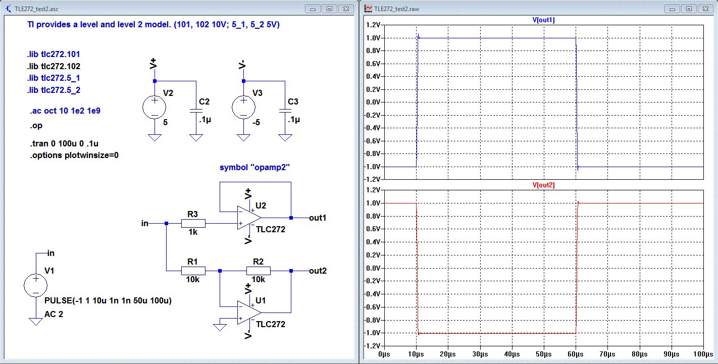 > Vielleicht sollte ich wirklich mal LTSpice testen. Das Installationsprogramm für LTspice gibt es hier. http://ltspice.linear-tech.com/software/LTspiceIV.exe Hier mal ein Beispiel mit LTspice. Das "European Resistor" Symbol gibt es im Ordner [Misc]. Die Modelldatei(en) und eventuell benötigte Zusatzsymbole(.asy) immer in dem jeweiligen Schaltplanordner(.asc) halten. .asc Schaltplan .plt Plot settings .asy Symbole .irgendwas Modelle .log Die Log-Datei mit Infos nach der Simulation .raw die Ausgabedatei Im zip-file ist noch ein anderes Beispiel mit "single" 5V Versorgung. Es gibt übrigens ein LTspice group. Dort gibt es ein Verzeichnis "Files" mit tausenden Beispielen. Speziell in Files>Lib findet man viele Beispiele mit Modellen anderer Hersteller. https://groups.yahoo.com/neo/groups/LTspice/info https://groups.yahoo.com/neo/groups/LTspice/files/%20Lib/ Um auf diese Seiten zu kommen solltest du einen Yahoo email account anlegen und dann die Gruppe "LTspice" abonnieren. Nachtrag: Die Kondensatoren C2 und C3 braucht man natürlich nicht für die Simulation. Die habe ich nur eingebaut falls jemand die Schaltung 1:1 nachbaut. Gruß Helmut