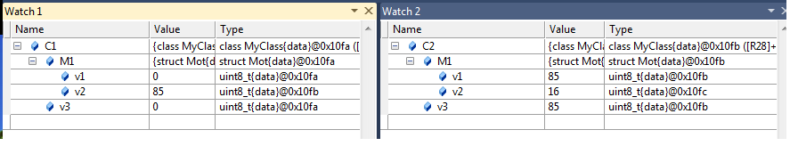 Hermann E. schrieb: > Die Werte von C1.M1.v1 und die von C2.M1.v1 sind nicht nur > unterschiedlich sondern auch völlig falsch !? Vielleicht mag der Simulator kein "static"... Versuch mal den Inhalt von "MyClass::M1" anzuzeigen