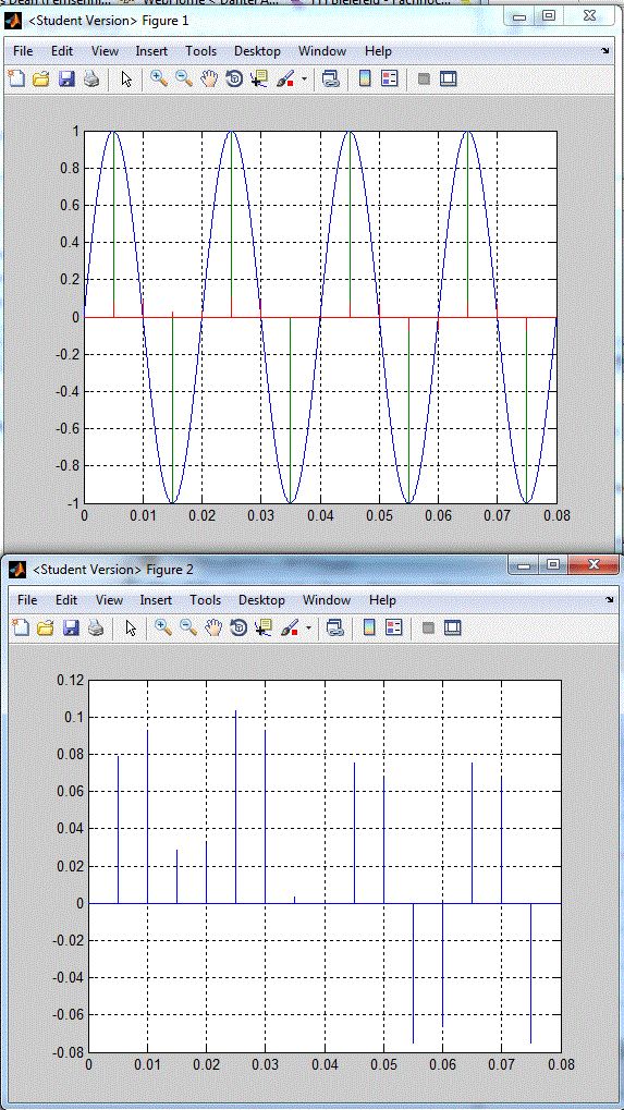 Hallo, ich bin gerade dabei in die digitale Filterung einzusteiegn. Dazu habe ich mir die FIR-Filter Koeffizienten für folgende Parameter ermittelt. Tiefpass - Butterworth Abtastfrequenz = 200Hz Grenzfrequenz = 5Hz Filter Ordnung = 2 Taps = 10 Den Algorithmus dazu hab ich dann in Matlab geschrieben, hab die Datei angehängt. Als Eingangsgröße hab ich mir eine simplen Sinus mit einer Frequenz von 50 Hz erstellt und die einzelnen Werte in ein Array gepackt. Mit Abtasrrate 1µs hab ich 80001 Werte. Ich stelle genau 4 Perioden dar. Wenn ich mir nun das Sinussignal mit einer Abtastfrequenz von 200 Hz abtaste, und die Werte durch den FIR-Filter jage bekommen stimmen die Werte am Ausgang des Filters nicht mit der erwarteten Dämpfung.. Im Bild ist das obere Diagramm der Sinus, die grüne Linie ist der Abtastzeitpunkt. Die rote Linie ist das Ausgangssignal des FIR-Filter. Das untere Diagramm ist reine Ausgangssignal des FIR-Filters Laut der Übertragungsfunktion sollte ja bei 50Hz eine Dämpfung von 20dB eintreten. Bei der Amplitude von 1V wären das 0.1V.. Nach dem "Einschwingen" > 10 Perioden kommen aber const. 0,0785 raus was -22 dB entspricht warum? Kann mir jemand erklären wo mein Denkfehler ist?