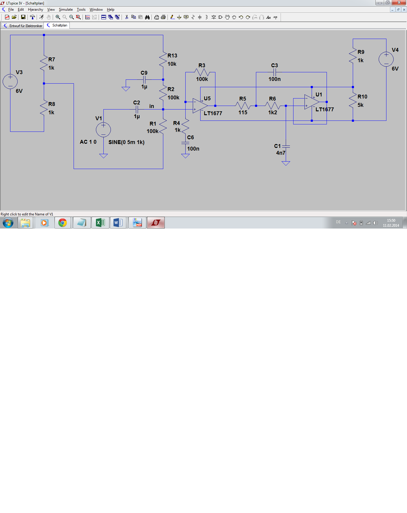 Badabeng schrieb: > Würde das so wie auf dem Screenshot gezeigt funktionieren? Was sagt denn LTSpice? > Da ich ein Anfänger bin, kann ich das nicht ganz glauben. Ich glaube das auch nicht. Hast Du denn nicht simuliert? Zumindest ist der zweite Entwurf schon mal besser als der erste. Man sieht U1 ist ein Filter, ein Tiefpass mit V=1 und soll vermutlich das Ausgangssignal liefern. U5 soll so ca. 100fach verstärken. Bei 5 mA Output belastet R5 mit 115 Ohm den OP so, dass er nur noch 575 mV liefern könnte. Das beträfe aber nur Frequenzen die abgeschnitten werden sollen, dies kann bei Überlagerungen aber ungünstig sein. Was gar nicht geht, woher soll U5 das Bezugspotential für den negativen Eingang her bekommen? Also C6 ist hier fehl am Platze. Dafür würde ich mit einem Kondensator parallel zu R3 die Bandbreite so weit wie möglich begrenzen. Bei V=100 sollte das Gain Bandwidth Product mit beachtet werden. Bis jetzt wissen wir nur, Du simulierst mit 5 mV bei 1 KHz. Nächster Knackpunkt ist die Masse. Gleichstrommässig schwimmt die Masse, bzw. ist gegenüber den Spannungsquellen sehr hochohmig gekoppelt Die zweite Batterie würde ich erst einmal weg lassen. Was Du brauchst ist hier eine virtuelle Masse. Entferne R1, R2, R13, C9, R7 und R8 und natürlich V3. Ich habe mal eben etwas zusammengestellt, siehe Anlage, was Du bei Dir integrieren könntest. Der Letzte Punkt wäre noch die Erzeugung der 5V. Der Spannungsteiler mit 1K/5K ist nicht gerade optimal, könnte aber halbwegs funktionieren. Die 5V müssen dabei aber mit einem Elko stabilisiert werden. Der Gleichstromanteil sieht aber weiterhin einen Innenwiderstand der Stromquelle von 1K//5K. Das ist nicht gerade gut. Wenn es ganz simpel sein soll, setze anstelle von den 5K eine Zenerdiode ein. Ob die 1K dann noch passen müsste man durchrechnen oder simulieren. Mach mal eine neue Simu fertig. Gruss Klaus.