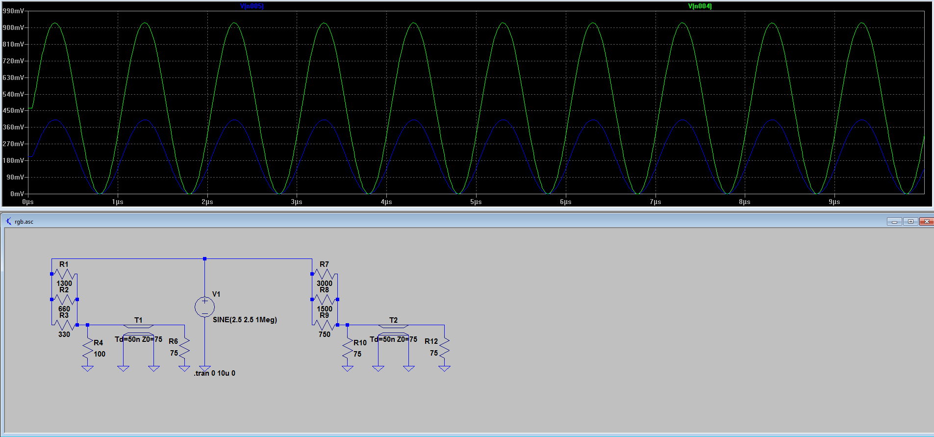Hi Ich möchte ein RGB Signal (über Scart) mit einem Atxmega mit 8 Pins erzeugen. Im Internet habe ich zwei Schaltungen gefunden, die das gleiche machen, allerdings nutzen diese 5V: Beitrag "einfache Grafikkarte mit 256x252 und 256 Farben für AVR" http://belogic.com/uzebox/schematics/EUzebox-schematic-V01-04.pdf Ich kann diese Schaltungen jedoch nicht nachvollziehen: Ich komme immer auf unterschiedliche Ergebnisse und niemals auf die geforderten 0,7Vss. Ich habe die simulierte Spiceschaltung anghängt, links ist Benedikts Schaltung (Grün) und rechts die Uzebox (Blau).