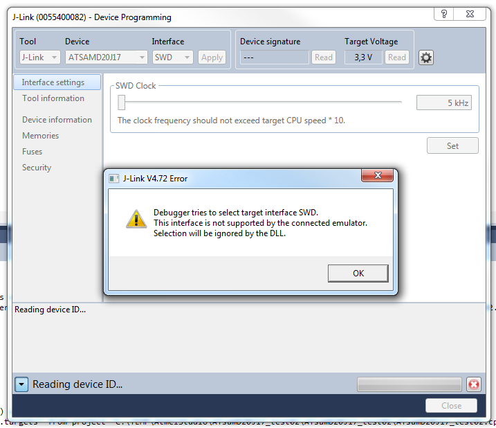 Hallo zusammen, ich versuche grade meinen ATSAMD20J17 zu Flashen, bekomme aber die im Screenshot gezeigte Fehlermeldung. Der schwarze Segger J-Link hat die HW Version 5.4 mit dem Produktionsdatum 06-46 (gebraucht aus der Bucht). Er wird von der Segger Software einwandfrei erkannt und ein Firmwareupdate gibt es auch nicht für den Programmer. Warum meint das Atmel Studio, das der J-Link kein SWD kann ? Wenn die Meldung lauten würde, kann das Target nicht finden oder so würde ich ja vermuten, das mein Board defekt ist, aber wenn er schon die Aktivierung der SWD Schnittstelle im Adapter nicht geht stehe ich auf dem Schlauch. Hat jemand eine Idee ? Gruß, dasrotemopped.