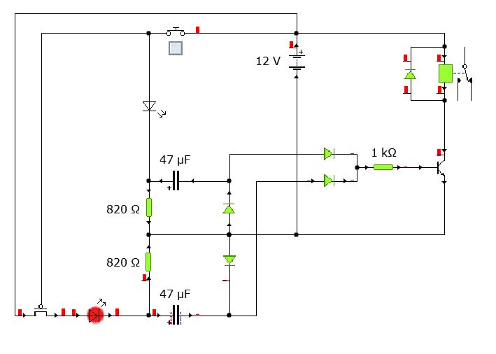 Oder mit einfachem Taster und zwei Transistoren (einfacher als Deine Variante):