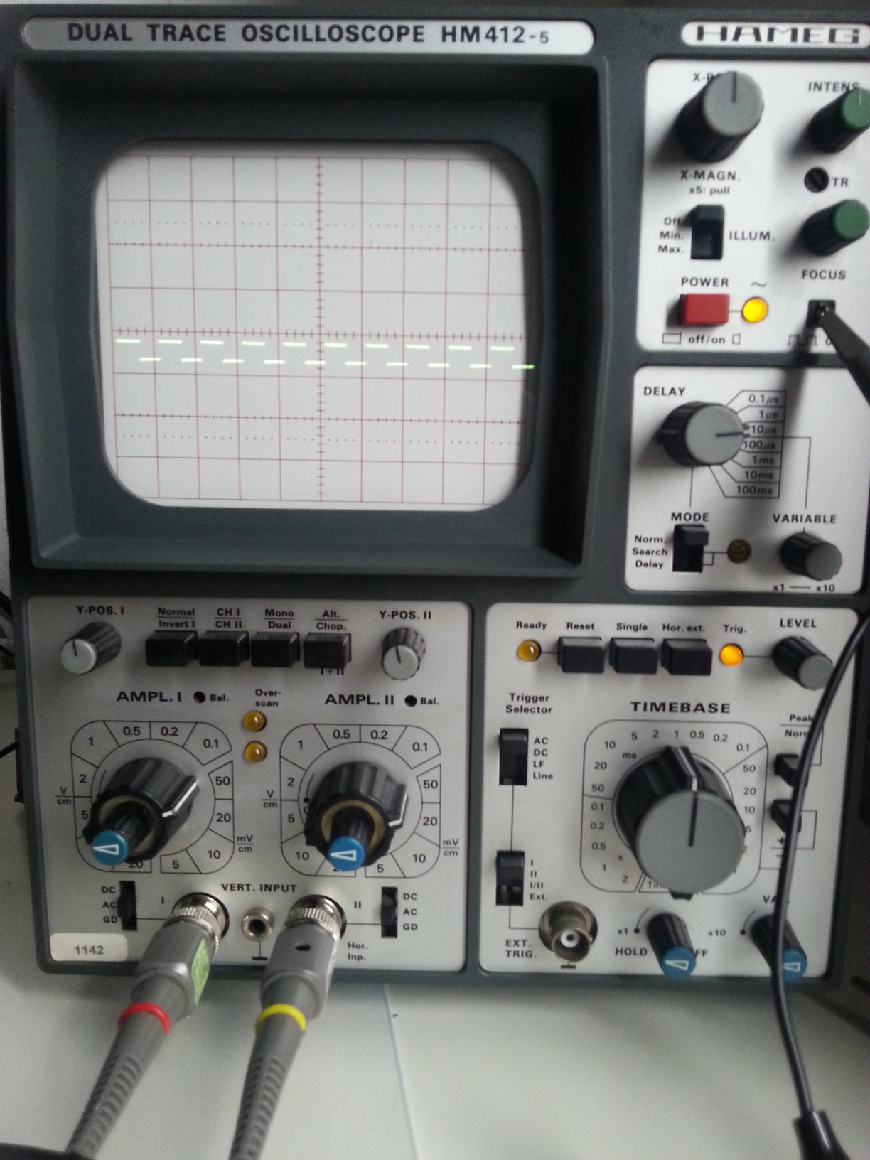 L. P. schrieb: > edit: sehe gerade, du bist bein CH1/2 auch in AC Kopplung unterwegs. Oh ist das Falsch? L. P. schrieb: > Das heißt beim Hameg 412-5 V/cm == V/Div. Ok danke. Wenn ich es auf 0,1 V/cm stelle läuft das signal nach links und Trigger leuchtet alle 3 sec kurz auf. Bei 0,5 V/cm ist es fast eine Linie die sich nach links bewegt. Und bei 2 V/cm ist es eine Linie die sich bewegt. Ist das so richtig?