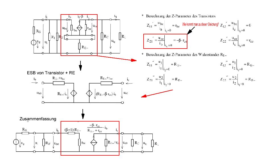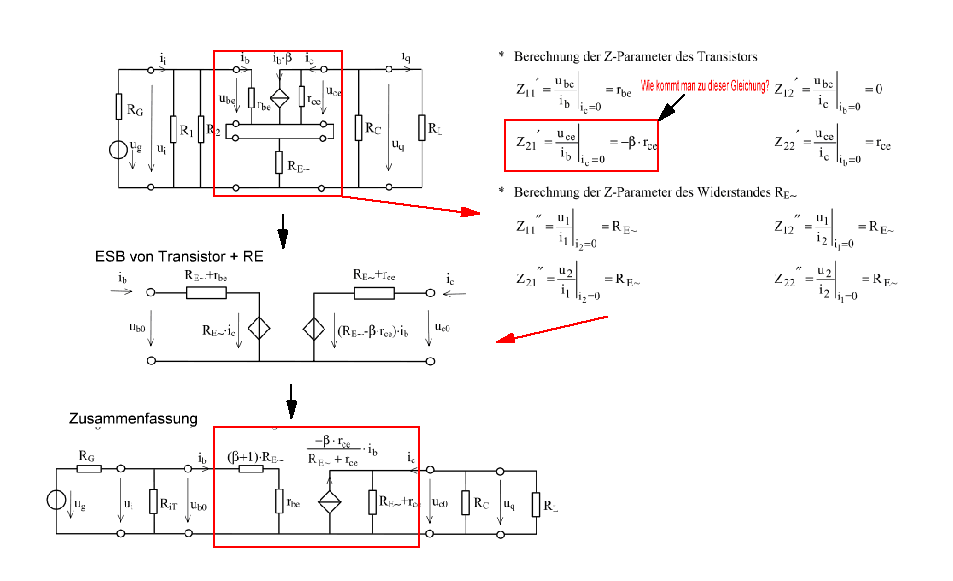 Hallo Leute Ich möchte gern das Ersatzschaltbild des bipolar Transistors in AC-Verstärkung verstählen. Kann mir einer sagen, wie man die Z-Parameter von der Emitterschaltung mit RE herausbekommt? Vielen Dank im Voraus :)