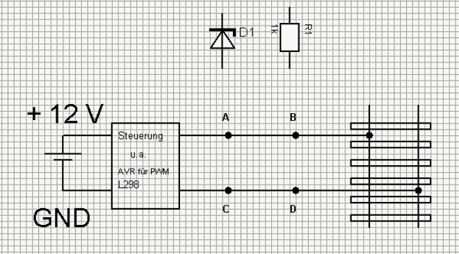 Hallo ... Für meine Modelleisenbahn habe ich u.a. eine 'Steuerung' (eigentlich nur einen stationären. Decoder)zusammengelötet. Die Steuerung erhält ihre Informationen vom PC über einen I²C-Bus (z.B.Fahrbefehle im Hinbblick auf Geschwindigkeit bzw. Vorwärts-Rückwärtsfahrt). Im AVR 2313 werden anhand dieser Informationen PWM-Signale erzeugt, die ich über einen Treiber (L298)zusammen mit den Signalen für Vorwärts- / Rüßckwärtsfahrt an die Schienen bringe. Das ganze Konzept funktioniert eigentlich auch recht gut, aber ... Lok's entgleisen manchmal, und dabei kann es zu doch sehr heftigen und langen Kurzschlüssen kommen ... Ein 'Experte' hat mir geraten, die Schaltung mit Zener-Dioden abzusichern ! Aber leider wußte dieser sog. 'Experte' nicht wie eine Zener-Diode plaziert wird (ja, ja... die 'Experten'???) Da ich noch nie mit diesem Bauteil in Berührung gekommen bin, deshalb die Frage WIE muss eine Z-Diode plaziert werden ? Kann mir (diesmal vielleicht ein erfahrener) Experte weiterhelfen und meine Frage anhand der beigfügten Prinzip-Schaltung erklären zwischen welchen Punkten (A,B,C,D) die Z-Diode (in welcher Richtung) und falls erforderlich ein Widerstand zu setzen sind ??? oder sind noch andere Bauteile erforderlich ??? oder gibt's noch eine bessere Lösung ??? Besten Dank im Voraus für alle Antworten Günter