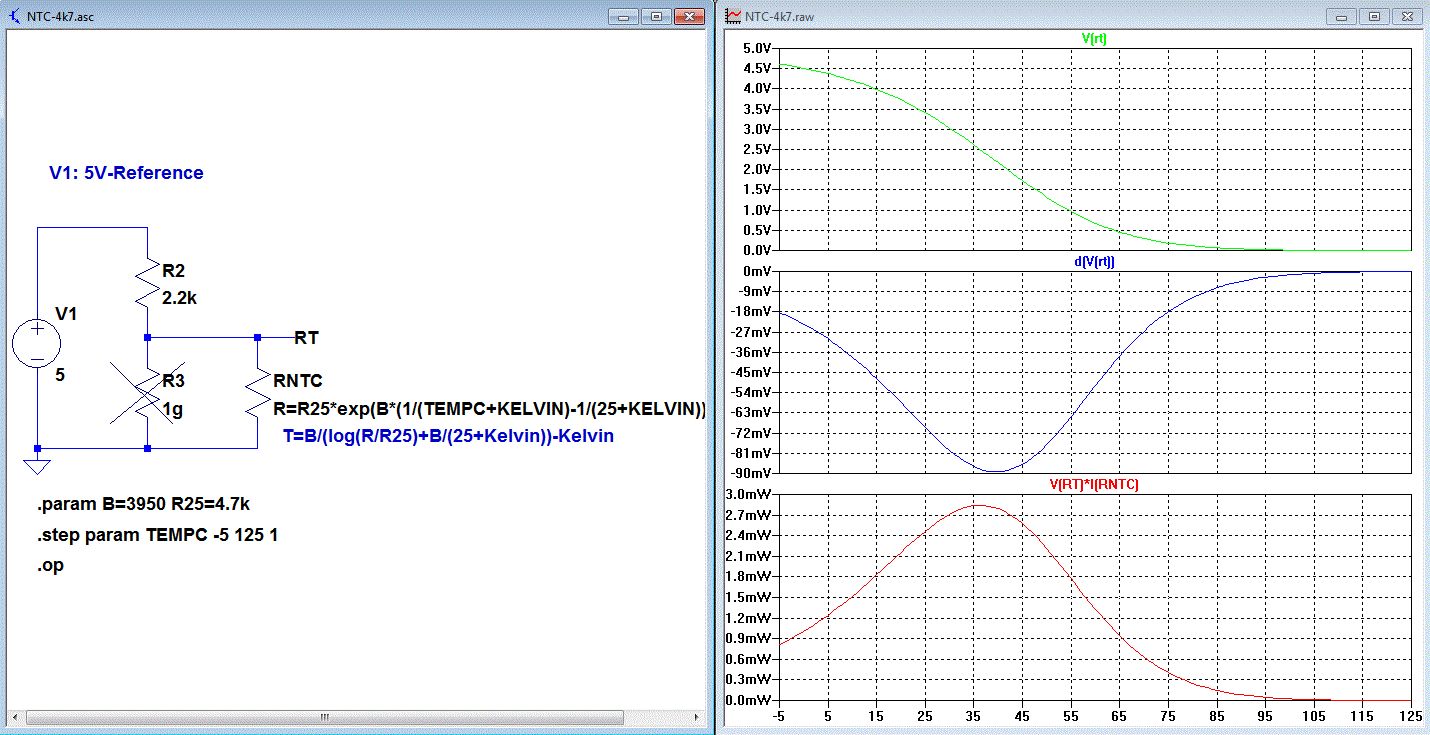 Du kannst den "besten" Vorwiderstand mit einem Mathe-Programm oder mit einem Schaltungssimulator optimieren. Angenommen du hast einen 10bit A/D Wandler und der kann auch die 10Bit Auflösung, dann kannst du 1° Auflösung von -5°C bis 85°C erreichen, wenn du einen 2,2kOhm Vorwiderstand nimmst. Oberhalb von (5°C hats du eine immer schlechter werdende Auflösung. Der NTC hat dabei bis zu 0,4° Selbsterwärmung auf Grund der Verlustleistung. Siehe Simulation mit LTspice. LTspice ist ein kostenloser SPICE-Simulator. http://ltspice.linear-tech.com/software/LTspiceIV.exe Die .asc Datei enthält den Schaltplan. Die .plt Datei enthält die Ploteinstellungen.