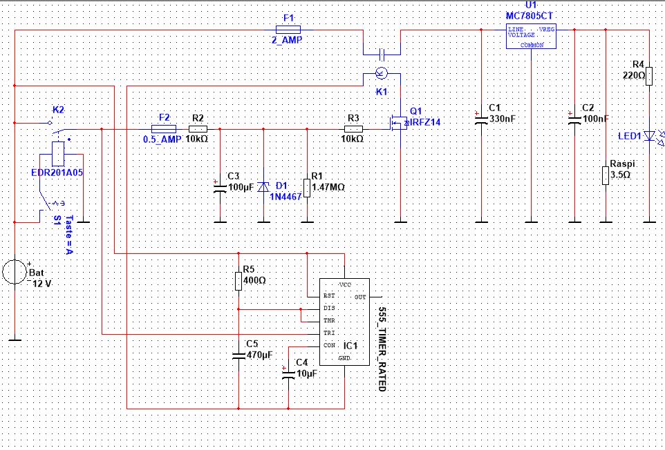 Hallo liebe Gemeinde, habe mich hier grad angemeldet in der Hoffnung hier nette Leute zu finden die mir bei meinem Problem helfen können. Ich Arbeite gerade an einer Schaltung um einen Raspberry Pi im Auto zu verwenden. Diese Schaltung soll die Spannungsversorgung für den Raspberry solange aufrecht erhalten, bis er ordnungsgemäß heruntergefahren ist. Gleichzeitig soll diese Schaltung dem Raspberry einen Impuls liefern der ihm sagt dass er herunterfahren soll. Ich Simuliere diese Schaltung im Moment mit Multisim 12. Mein Problem ist nun dass mir immer wieder Fehler angezeigt werden wenn ich die Schaltung simuliere. Hoffe ihr könnt mir helfen. Gruß Stefan