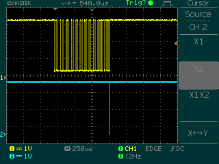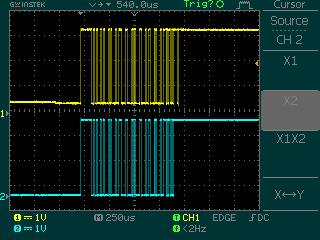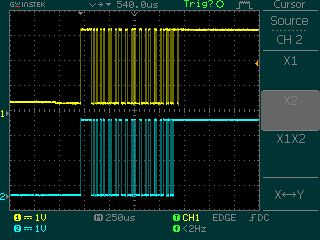 Hallo zusammen Ich bin schon sehr lange auf der Suche, warum der CAN1 auf einem STM3240G-EVAL nichts empfängt, bzw. der IRQ gar nie auslöst. Das Input-Signal auf dem Port habe ich definitiv. (Mit dem Oszi gemessen). Das Senden vom Board (TX) funktioniert ohne Probleme. Die KO Plots zeigen mit CH1 (gelb) das RX vom ST Prozessor, mit CH2 (blau) das TX vom ST Prozessor. Kann mir da jemand helfen? Vielen Dank