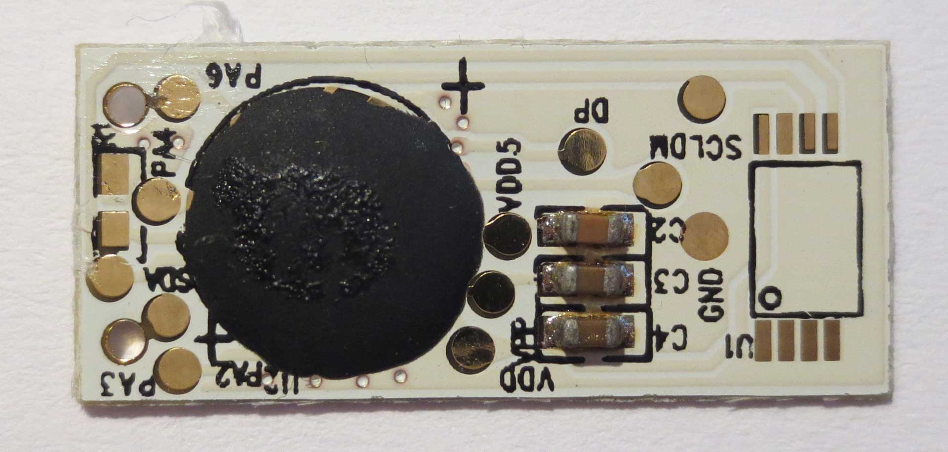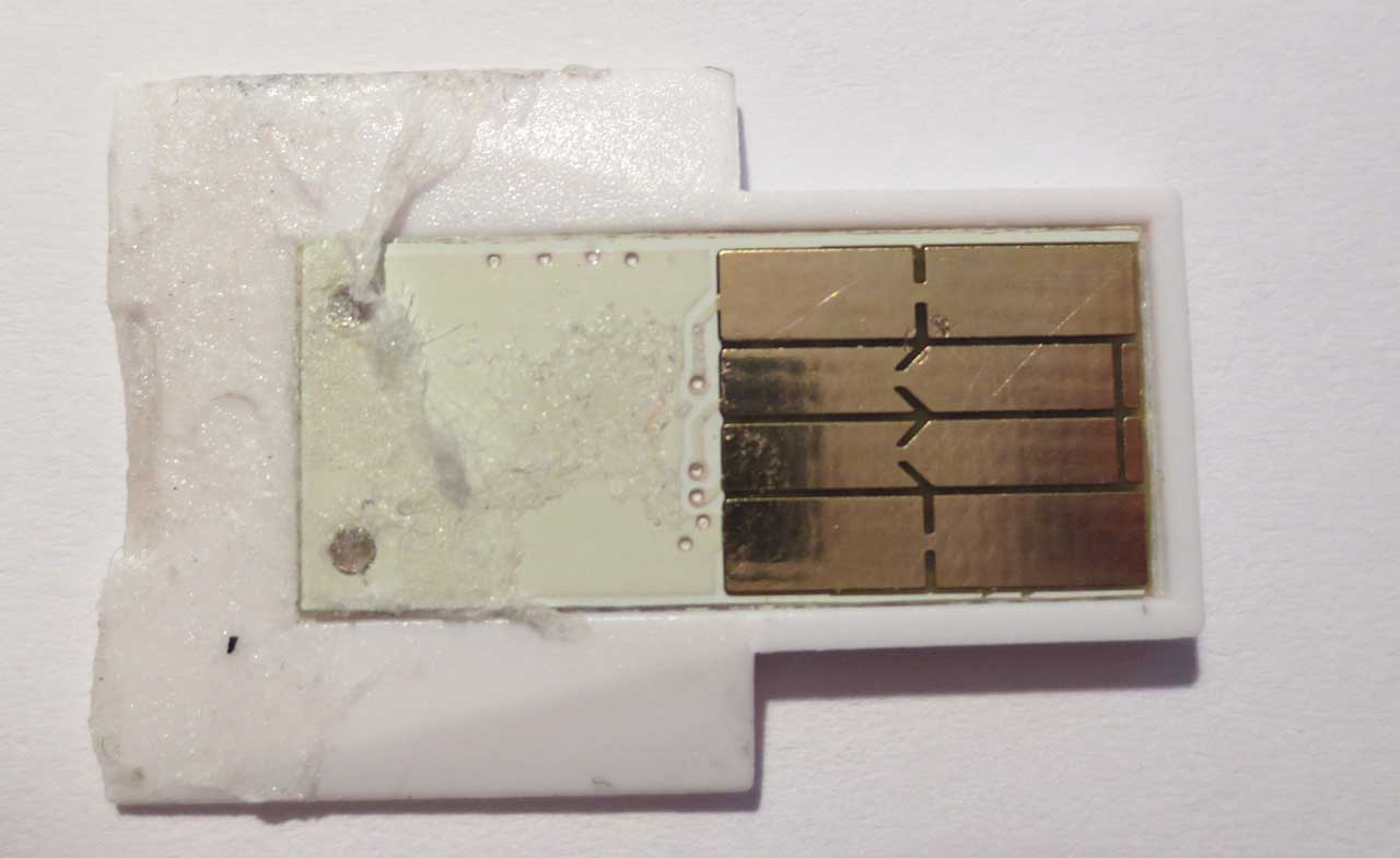 Infineon hat heute auf der Embedded auch kleine USB-Keys verteilt, die sich als Tastatur (HID Device) anmelden und anschließend die XMC-Website öffnen. Ich habe meinen natürlich sofort auseinandergenommen. Auf dem Board finden sich etliche beschriftete Testpads und ein freier Platz für einen 8pinner. Bei einer solchen Anwendung wird mit Sicherheit kein maskenprogrammiertes ROM verwendet. Vielleicht lässt sich der Stick umprogrammieren? Kann natürlich auch OTP sein. Pinbezeichnungen: PA2 PA3 PA4 PA5 VDD VPP VDD5 GND SDA SCL DP DM Klingt nach Spannungsversorgung, I2C, USB.