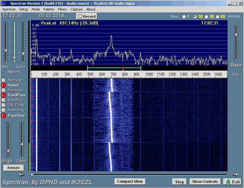 Hallo HST > Ein 3,58MHz-Keramikresonator mit 80kHz Ziehbereich? Im Prinzip sogar bis 3,4 MHz, aber unter 3,5 MHz lässt die Stabilität deutlich nach. Grundsätzlich ist die Drift etwas größer, als bei einem Quarz. Hier schwingt er auf 3,5 MHz. Empfangen wurde mit Hilfe eines DAB Sticks die 20. Harmonische bei 70 MHz. Die Drift bei 3,5 MHz war also um Faktor 20 geringer. Der Resonator wurde zur Vermeidung von Zugluft in ein Styropor-Kästchen mit 5mm Wandstärke eingepackt. https://www.mikrocontroller.net/attachment/195476/vxo.mp3 Es hat sich um einen Röhren-Oszillator gehandelt und der DAB-Stick ist auch nicht komplett driftfrei. Gruß, Bernd Nachtrag: Der Soundfile hat eine Länge von genau 1 Minute und läuft endlos. Dadurch wird auf dem Wasserfall schön die Drift pro Minute als Stufe sichtbar.