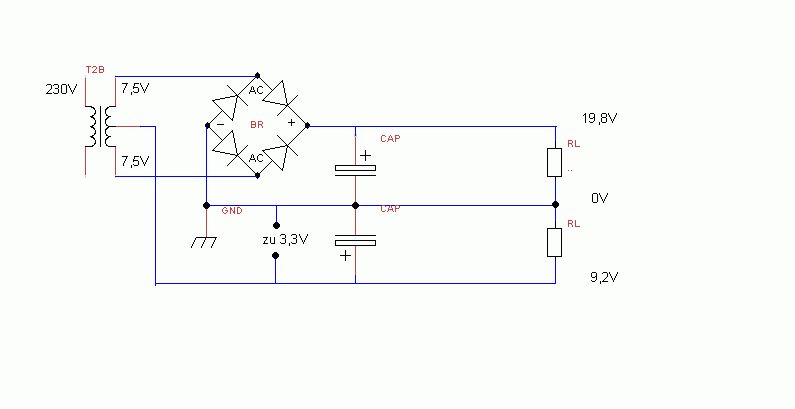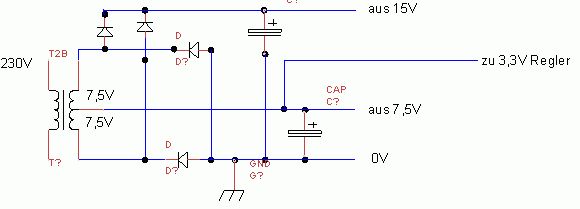 Hallo, als Trafo möchte ich einen vorhandenen nehmen, mit 2x7,5V und gemeinsamer Mittelanzapfung, ges. 1.8A. 15V für die 12V 7,5 für die 5V, dazu parallel die 3,3V. Nun beschäftigt mich die Frage, wie die Gleichrichtung auszuführen ist um gemeinsame Masse zu erhalten? Gruß Gerd
