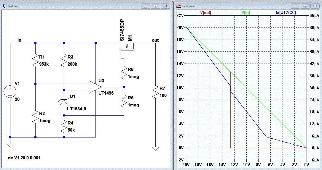 Hallo, ich möchte folgendes realisieren wie im ltspice file zu sehene ist: eine Spannungsquelle fällt von 20 auf 0 V herunter und der Ausgang wird bei ca. 12,7V ausgeschaltet. Ich habe das ganze ding berechnet nach folgendem Magazin/Journal:http://cds.linear.com/docs/en/lt-journal/LT1389_0699_Mag.pdf und probiere das ganze zu simulieren. Leider scheint es mir als wenn der präzisions shunt widerstand nicht richtig funktioniert? Könnt ihr mir helfen? Lg Machete