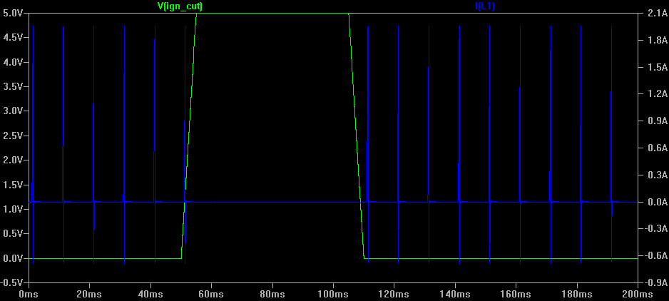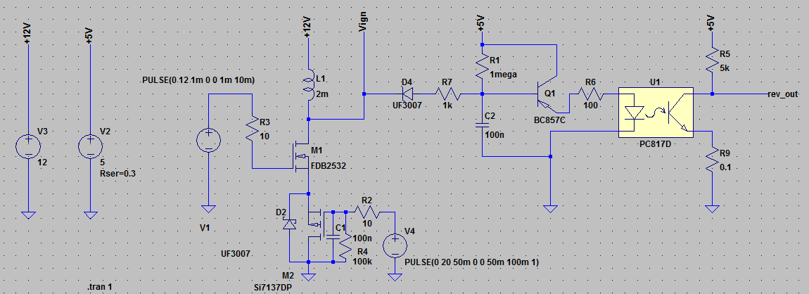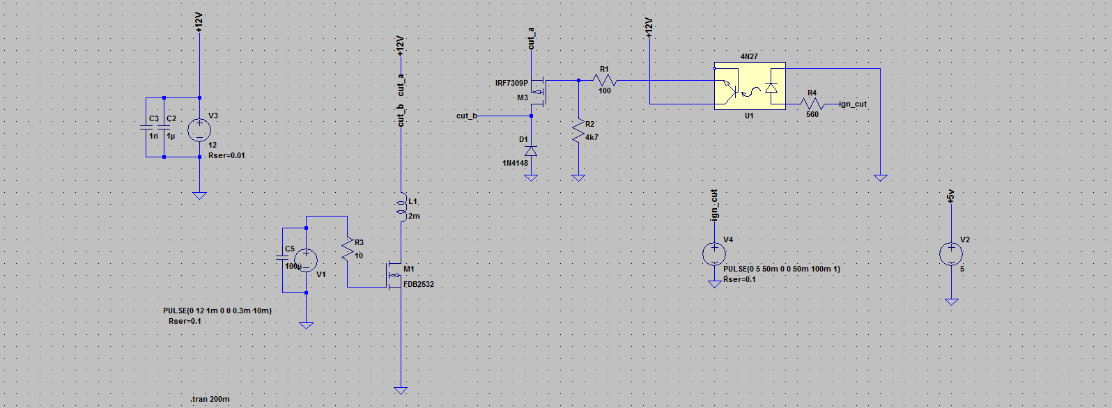 Moin allerseits. Ich entwickle gerade einen so genannten Quickshifter für Motorräder. (Rechts- und Legalitätsfragen müssen nicht diskutiert werden, Gebrauch wird nur privat und auf Rennstrecke stattfinden.) Unter Zuhilfenahme der hiesigen Posts zu Zündunterbrechern, elektronischer Zündungen und Drehzahlmesser habe ich Schaltungen für Drehzahlmesser und Zündunterbrecher entworfen (die zumindest in der Simulation funktionieren). Schaltungen und Simulationsergebnisse habe ich angehängt, die Wahl der konkreten Komponenten ist noch nicht final, beim DZM ist die Unterbrechung auf Masseseite nur ein Test - bitte diese nicht ernst nehmen ;) Zur Spannungsversorgung der Logik mit 5 Volt habe ich funktionierende Schaltungen, die µC-Eingänge werden auch entsprechend entstört werden. Unsicher hingegen bin ich bei der "Aufladezeit", der Induktivität und dem Gleichstromwiderstand der Zündspule(n) (moderne Aufsteckzündkerzen, Drehzahlen bis ~12k U/min). Für Anregungen und Verbesserungsvorschläge bin ich offen ;)