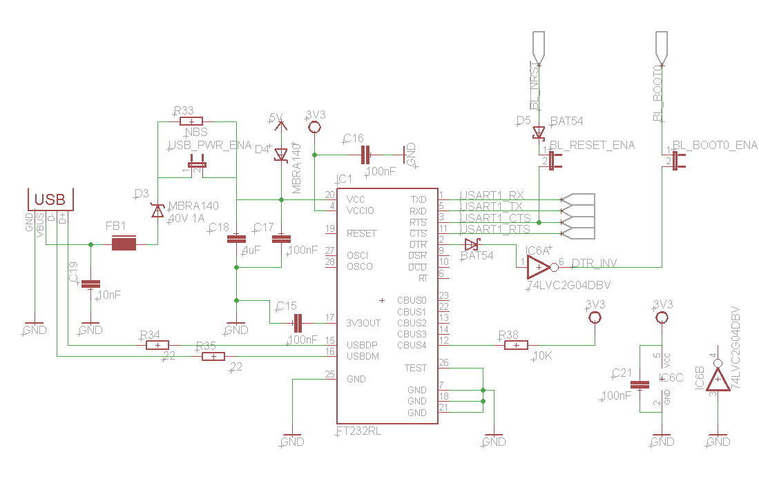 Ich möchte gerne eine Platine, die zusätzlich noch extern versorgt werden kann, optional über USB versorgen. Im DS vom FTDI wird eine FET Schaltung vorgeschlagen. Ich würde lieber die "Umschaltung" der Versorgung über die Shottky Dioden realisieren. Kann bitte jemand drüber schauen, ob die Beschaltung soweit ok ist? Die Dioden vertragen locker 1A, sollte ausreichend sein.