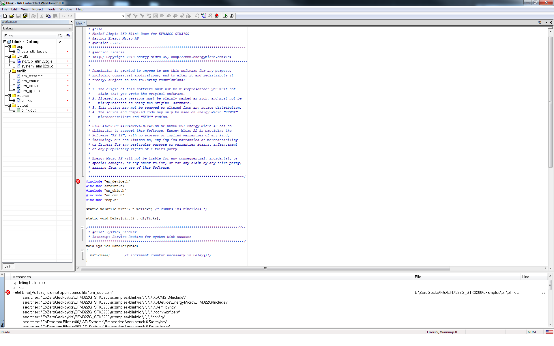 Liebe Kollegen! Ich verwende IAR Embedded Workbench for ARM 6.7 zusammen mit einem Silicon Labratories EFM32 Zero Gecko Starter Kit. Gestern haben die Musterprogramme funktioniert, ich konnte auch etwas in der main.c ändern und auf den µC spielen. Heute findet die IAR die .h Dateien nicht mehr. Meine erfolglosen Versuche: *) Pfade zu den .h Files in den Preprozessor schreiben (es kommen immer neue Fehler) *) Beispielprogramm neu downloaden (keine Änderung) *) IAR neu installieren (keine Änderung) Kann mir jemand sagen wieso er plötzlich die Dateien nicht findet? DANKE! Sandy