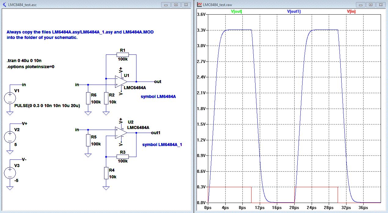 Hallo, zum Abschluss noch ein Beispiel mit neuen Symbolen für den LMC6484A. Die Symbole passen in der Größe zu den Standard-Symbolen in LTspice. Tipp: Das Symbol "opamp2.asy" eignet sich gut als Startbasis für spezifische Opamp-Modelle. Bei dem LMC6484A-Modell hätte man auch direkt das "opamp2" Symbol nehmen können. Da hätte man dann nur noch ein .lib filename für das Subcircuit gebraucht. Gruß Helmut PS: Dieses Beispiel(zip-file) werde ich auch in die LTspice Yahoo group unter Files>Lib speichern. https://groups.yahoo.com/neo/groups/LTspice/files/%20Lib/