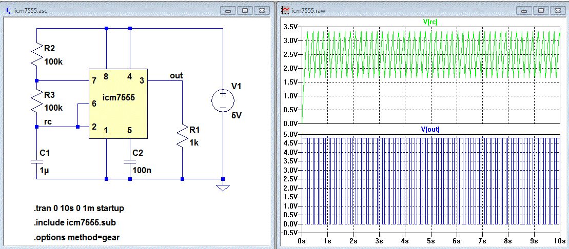 Du machst alles richtig, aber LTspice braucht hier etwas Konvergenz-Hilfe. "Startup" lässt die Spannungsquellen V in 20us von 0V nach 5V "hochrampen". .tran 0 10s 0 1m startup Der Gear-solver hat ein bisschen "Tiefpassverhalten". Das hilft in manchen Fällen. .options method=gear