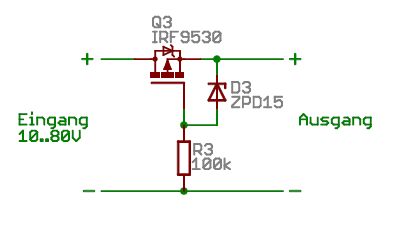 Axel Schwenke schrieb: > Die gezeigte Schaltung tut nicht, was sie laut Bildunterschrift tun > soll. Eingang und Ausgang sind vertauscht. Nö, die sind schon richtig: bei richtiger Polarität fließt der Strom zuerst über die Substratdiode und zieht den Ausgang (Source) nach oben. Dadurch wird der FET aufgesteuert und es fällt fast keine Spannung mehr an ihm ab. (Wie Falk geschrieben hat: dem aufgesteuerten FET ist die Stromrichtung egal). Bei falscher Polarität am Eingang bleibt der PMOS einfach hochohmig.