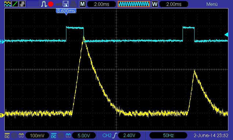 Markus M. schrieb: > ...das Problem mit den Photodioden ist aber, dass sie nur sehr kleine > Ströme liefern. Somit kommt man um einen OP nicht herum. > > Damit hat man schon wieder mehr Bauteile auf der Platine. OP und > Hühnerfutter... Ui, ja, ok. Muss zugeben, dass ich noch nicht mit Photodioden gearbeitet habe. Ich habe dazu gerade folgendes gefunden: Beitrag "Re: Photodiode messen" "An die Fotodiode wird eine Spannung in Sperrichtung angeschlossen, die zu einer Verstärkung des Fotostromes führen kann (auf die Beschaltung beziehen sich offensichtlich die Angaben im Datenblatt, V_R wird in Sperrichtung angelegt und über einen Widerstand im Kreis kann wieder eine stromproportionale Spannung abgegriffen werden). Nachteil: U.a. geringere Linearität (sollte in diesem Fall lt. Datenblatt aber unproblematisch sein)." Habe gerade mal in Datenblättern nachgelesen, was der Schaltzeitunterschied zwischen Fototransistor und Fotodiode eigentlich ist. Transistor: 5µs http://www.vishay.com/docs/81504/bpv11.pdf Diode: 2,5ns http://www.vishay.com/docs/81502/bpv10.pdf Ist also schon Faktor 1.000, bei 100 kHz Messfrequenz haben wir nur 10µs für die Messung. Mit der Frequenz kann man schon noch ein bisschen runtergehen, so bis 40-50 kHz, aber dann sinds auch nur 20µs und damit noch im Schaltzeitbereich des Transistors. Ich würde also sagen: um es so zu machen wie ich skizziert habe muss es eine Fotodiode sein.