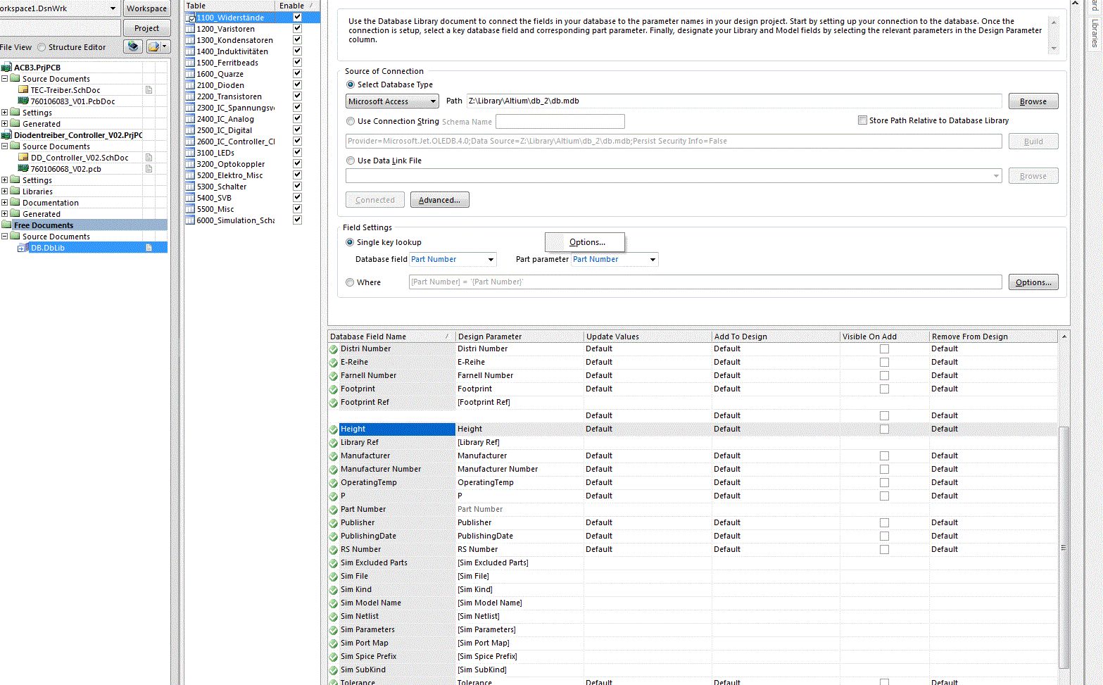 Christian hat ja schon gut erklärt. Nur noch ein paar Anmerkungen Eine Datenbank braucht immer ein Feld mit einer eindeutigen ID das Key-Feld (siehe Single key lookup Setting im Altium), voll kommen egal was es ist hauptsächlich einmalig. Darüber macht Altium die eindeutige Verknüpfung zum Bauteil z.B. beim Update from Library. Bei mir eine eigene Part_Number oft aber auch nur eine fortlaufende Nummer. Dann brauchst Du zwei Parameter für das Symbol Library Ref - entspricht der Symbol Reference in der SchLib Library Path - Pfad und Dateiname der SchLib aus der das Symbol kommen soll, gibt man den nicht an sucht Altium in den Installierten Libs. Ich hab den relativ zur DbLib angegeben z.B. \SourceLibs\Meine.SchLib Für das Footprint gilt das Gleiche Footprint Ref - entspricht Name in der PcbLib Footprint Path - Pfad und Dateiname PcbLib Alle anderen Spalten sind optional kannst Du erstmal weg lassen. Such mal auf YouTube nach "Database Library in Altium Designer" erster Treffer, ist auf Englisch aber trotzdem sehr gut. Ein Hinweis noch, wenn Du eine Spalte wie z.B. Comment hast kannst Du einstellen ob er den Comment aus der SchLib überschreiben soll oder nicht. Default ist (wenn ich mich nicht irre) das er nur überschrieben wird wenn er nicht leer ist.
