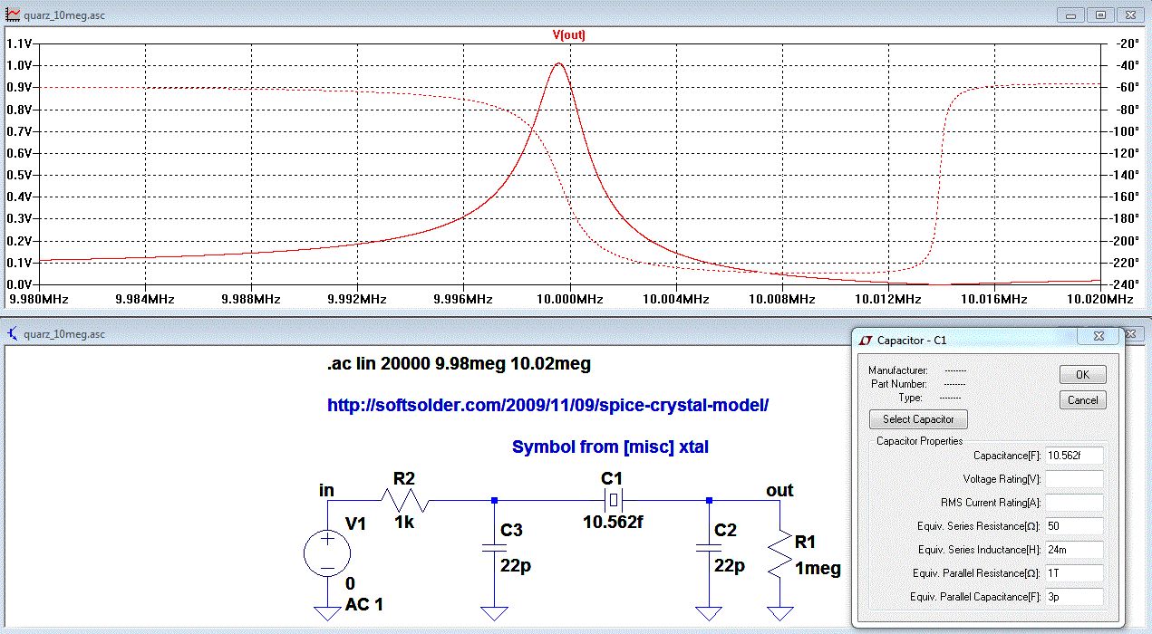 Hallo Christian, Ein Quarzersatzschaltbild besteht aus L und C und R in Reihe und parallel zu allem eine Halterungs-Kapazität Cpar. L im Bereich mH C im Bereich femtoFarad R im Bereich 30 bis 200Ohm Cpar 2pF bis 5pF Güte Q im Bereich 10000 bis 100000 Güte Q = sqrt(L/C) / R f0 = 1/(2*pi*sqrt(L*C)) Man kann jetzt entweder 4 Bauteile nehmen oder man nimmt das Bauteil cap (Kondensator) in LTspice. Dieses Bauteil hat intern auch schon diese ganzen Zusatzbauteile. Damit so ein "C" als Quarz aussieht, gibt es auch ein Kondensatorsymbol xtal. Platziere ein C oder [misc] xtal. Danach rechter Mausklick auf das Symbol und trage in dem Dialog Series Res., Series ind., Parallel Res. 1T, Parallel Cap. ein. Hinweis: C1 ist der Quarz. Die Schaltung drumherum zeigt die typische Beschaltung wie bei einem Quarzoszillator. Die Quelle V1 ist dort dann ein invertierender Verstärker. Gruß Helmut
