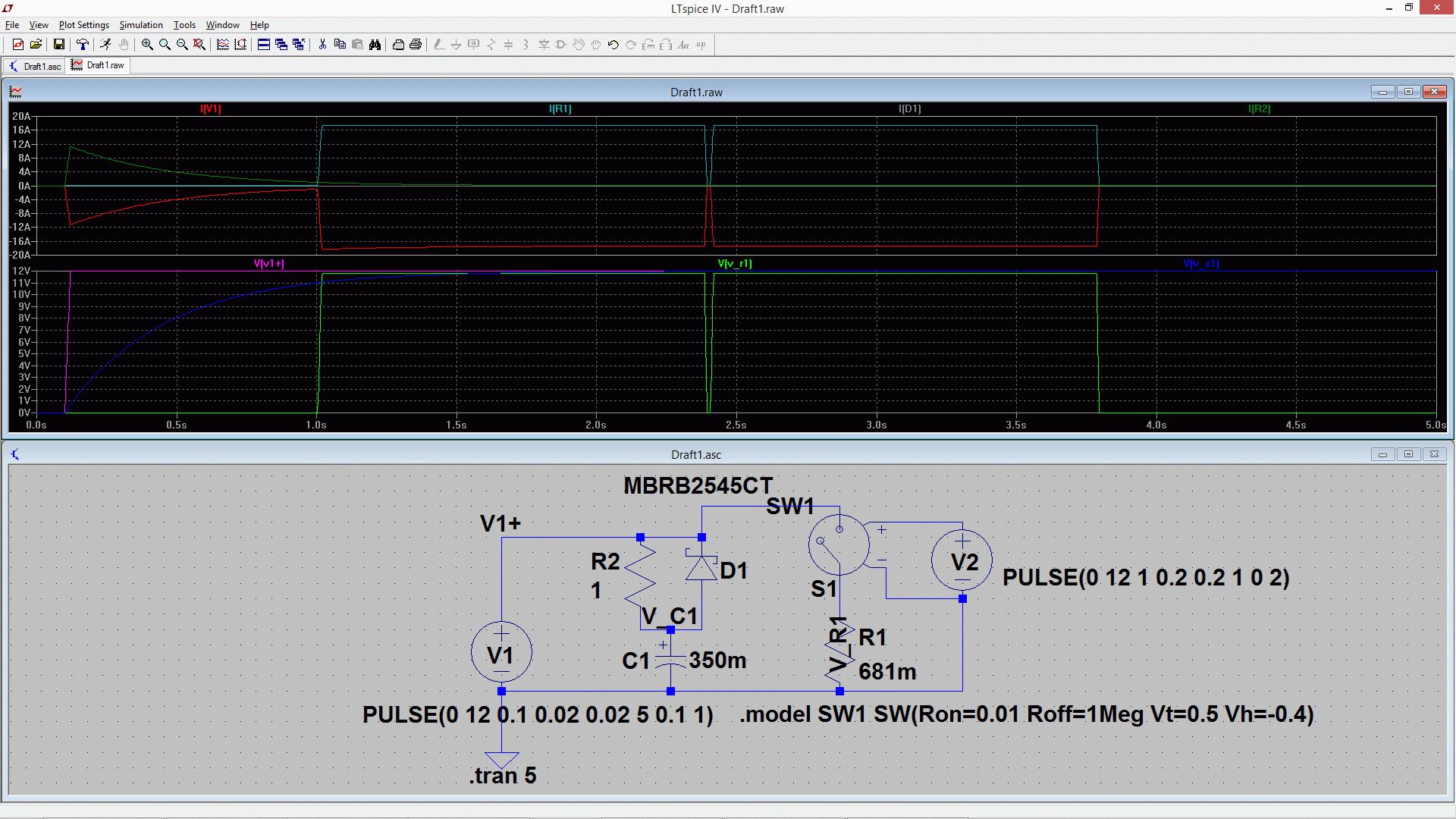 Tom B. schrieb: > Luca E. schrieb: >> Tom B. schrieb: >>> Vielleicht mit einem mittels Diode überbrückten >> >> In deinem Schaltplan sind allerdings die Diode und der Widerstand >> überbrückt... > > Jain. Hab da eher an den grünen Fall (Strom vom Netzteil reicht) und den > roten Fall (Strom vom Kondensator wird gebraucht) gedacht. Iwie mache ich wohl was falsch, aber die Spannung aus dem Pufferkondensator C1 wird nie abgerufen. NT als V1, Schalter mit AS ist SW1. Einschaltpunkt SW1 bei 1sek. Beim Einschalten von SW1 fliessen weder über R2 noch über D1 Ströme. Oder mach ich hier was verkehrt?
