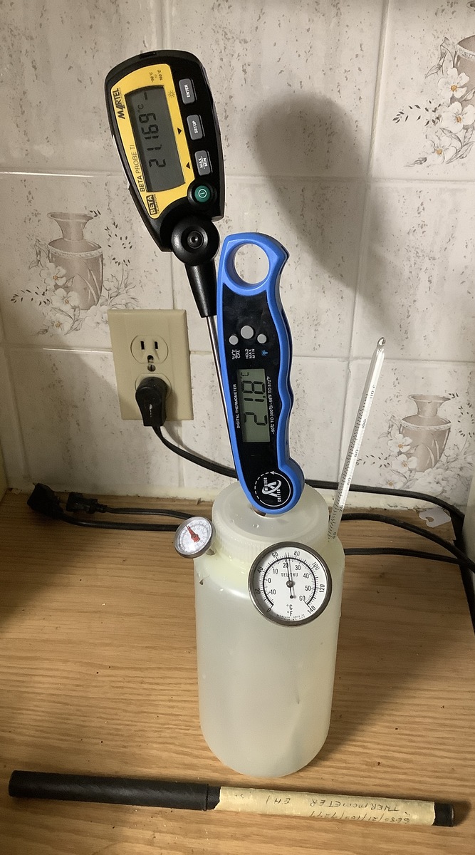 Thermometer Vergleich Da ich bald wieder analoge Filmfotografie aufnehmen will, wollte ich mich vergewissern, dass meine Thermometer noch mitspielen. Ich bin primär an den Abweichungen um 20 Grad interessiert. Ich borgte mir zu diesen Unterfangen von der Firma ein jährlich zertifiziertes Vergleichsthermometer mit ausreichender Auflösung und Grundgenauigkeit. Von früher her hatte ich noch diese mit Löchern versehene Plastikflasche. Damals arbeite ich mir Eiswasser für den Nullpunkt. In die vier Löcher oben kann man die Thermometer einstecken. (Der Q&D Teil) Nach einer Stabilisierungszeit von 1Std ergaben sich interessante Ergebnisse: Das AEI Hg-Laborthermometer stimmt mit dem Vergleichsthermometer, so gut es ablesungstechnisch möglich ist, genau überein. Das vorne sichtbare Tel-Tru ist mein damaliges (48J) Photo-Entwicklungs Thermometer aus 1977 und dürfte auf +/- 0.5Grad zuverlässige Ergebnisse liefern. Mehr ist bei der Größe der Skala und Messbereich nicht rauszuholen. (Ist mir aber ausreichend, solange man immer gleiche Temperatur des Entwicklers anstrebt und bei der Entwicklung gewissenhaft und konsistent vorgeht) Das kleine Chinesische ist ablesungsmäßig zu klein, um es besser als +/- 1Grad ablesen zu können, liest aber sonst ohne sichtbare Abweichung ab. Das (billige) Digitale in der Mitte stammt aus einem Gebrauchtgeschäft. Ist aber justierbar und ausreichend nahe an der Solltemperatur.