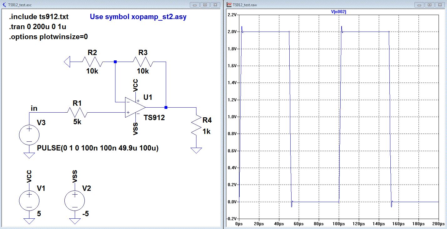 Hallo, Anstatt zu probieren hättest du in der LTspice Yahoo group suchen können. Dort gibt es unter anderem eine Files-section. Files > Lib > TS912_test.zip https://groups.yahoo.com/neo/groups/LTspice/files/%20Lib/ Gruß Helmut https://groups.yahoo.com/neo/groups/LTspice/info