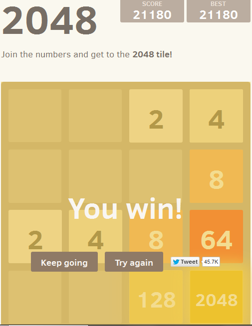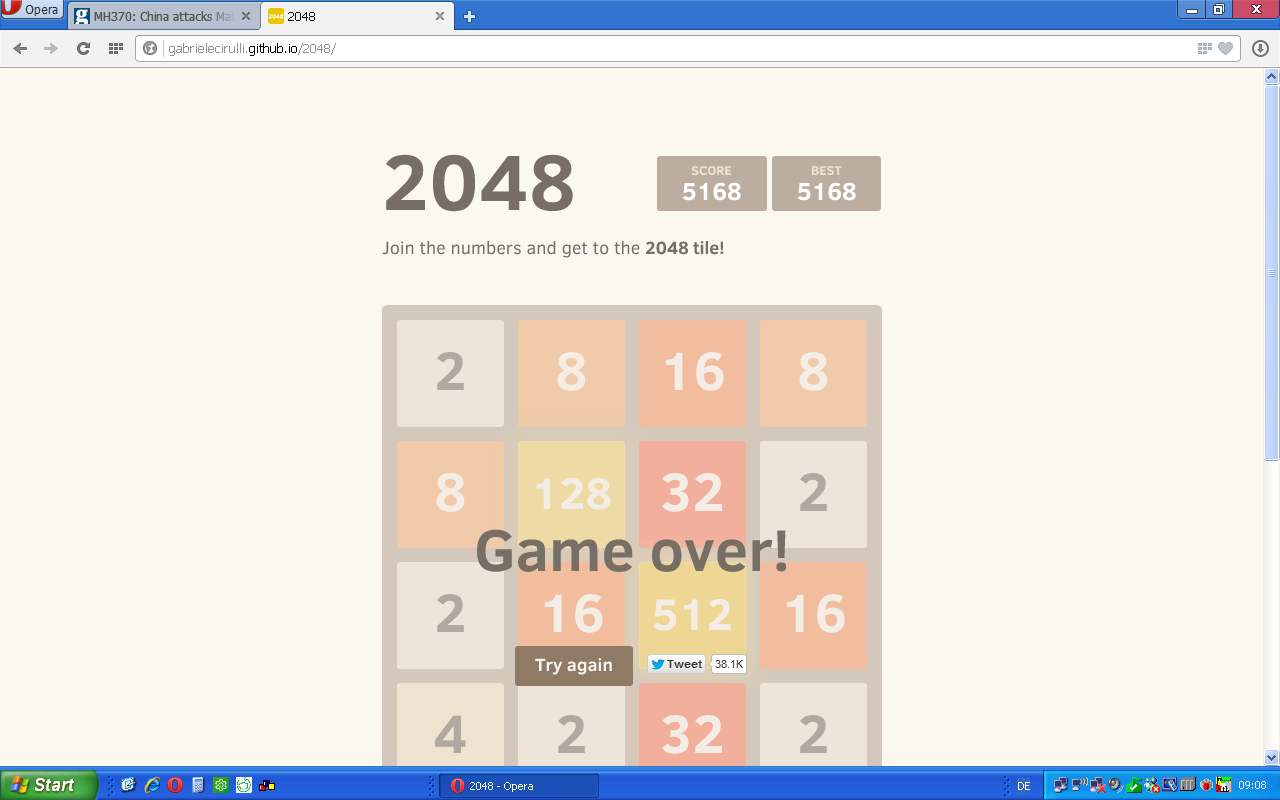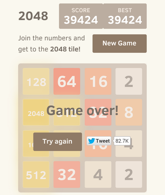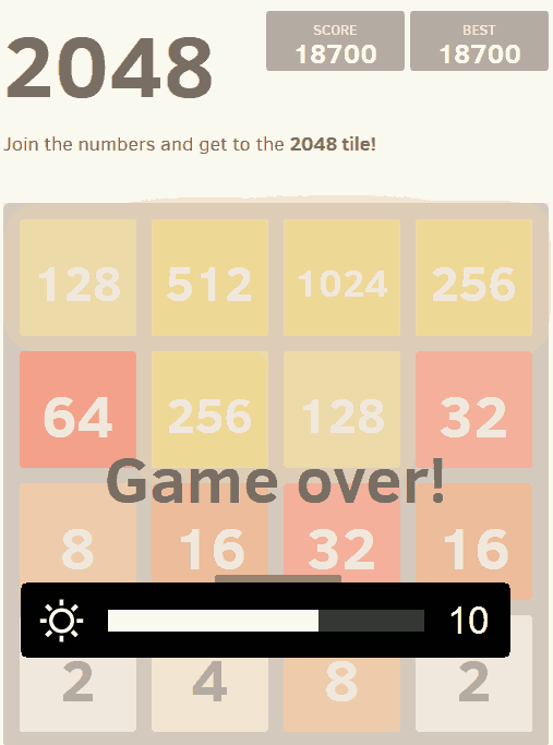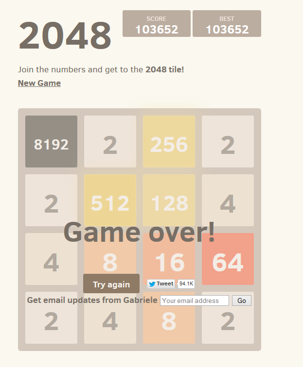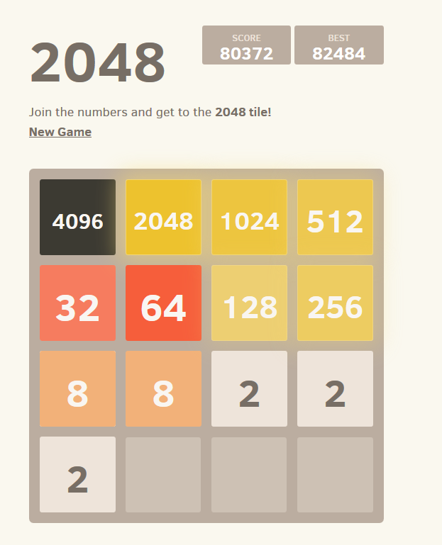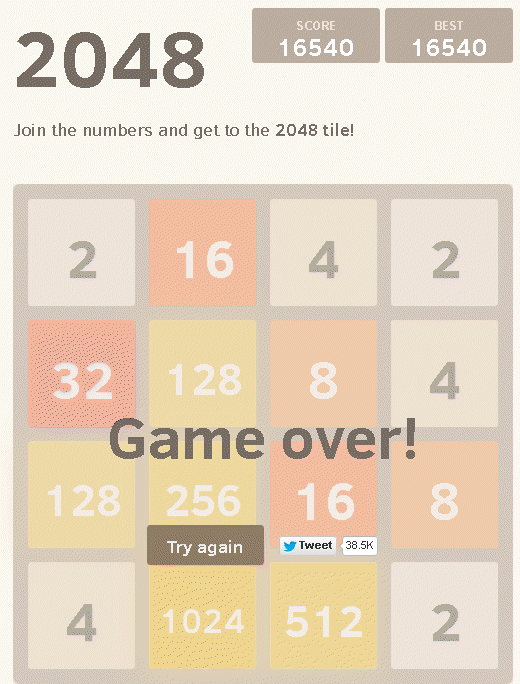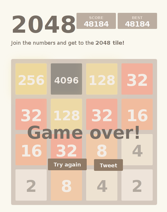 Es gibt tatsächlich ein Leben jenseits der 2048er-Kachel :) Die 50000-Punktegrenze hätte ich vielleicht geschafft, wenn ich nicht kurz zuvor aus Versehen die falsche Taste gedrückt hätte. Irgendwie lässt die Konzentation mit der Zeit schon stark nach. Hat schon jemand die 8192er-Kachel erreicht?