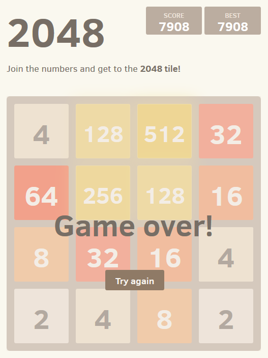 Das ging aber schnell. Ja, zum Ende wird es auf dem 4x4 Feld wirklich knapp und ich hätte nicht gedacht, das es jemand schafft. Ich gehe ähnlich wie du vor und sammle die Reihen oben, allerdings in die andere Richtung und habe auch schon die 4096 geknackt. Aber 8192 ist eine ganz andere Klasse. Du hast übrigens Post.